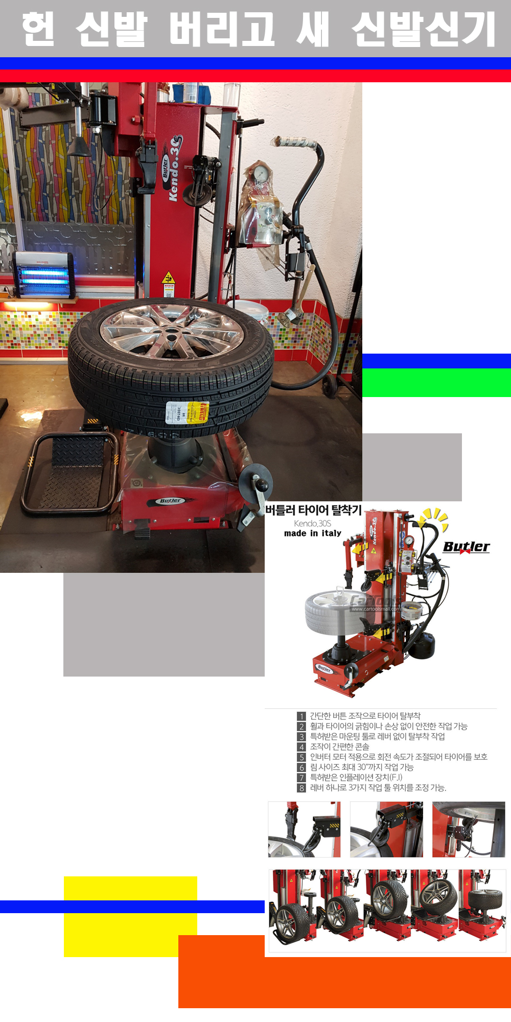 이태리 버틀러사의 켄도3.0S는 휠과 타이어와 조립과 분리시 전혀 제품에 손상을 주지않는 탈착기로 특히 센터락방식(중앙에서 휠를 고정하는 방식)이여서 휠의 중앙부위 잡아서 타이어를 탈부착하고 이후 상하롤러로 타이어를 탈부착합니다 특히 유니포미티작업(휠의 가장가벼운부분과 타이어의 가장 무거운부분을 매칭시키는 작업)시 작업자가 타이어를 정확한 지점에 휠과 매칭시킬수 있는 장점도 있습니다