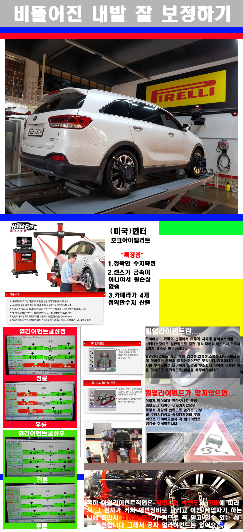 자사는 얼라이먼트정렬시 교정전 교정후를 구분하여 고객님께 직접 이수치값을 확인시켜드리고 작업을 하며 이후 각각의 특성을 가진 타이어들에 대해서 설명 및 관리요령 운전요령 같이 설명해드리고 있습니다