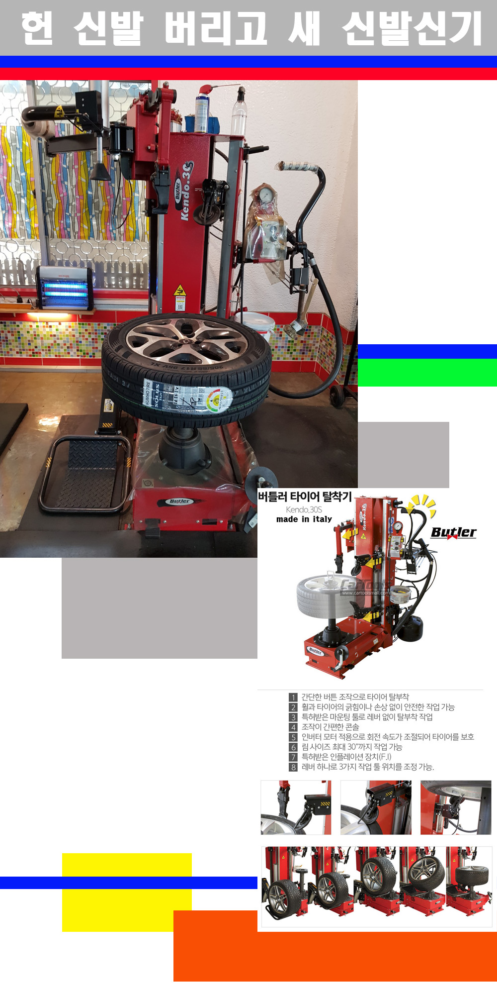 이태리 버틀러사의 켄도3.0S는 휠과 타이어와 조립과 분리시 전혀 제품에 손상을 주지않는 탈착기로 특히 센터락방식이여서 휠의 중앙부위 잡아서 타이어를 탈부착하고 이후 상하롤러로 타이어를 탈부착합니다 특히 유니포미티작업(휠의 가장가벼운부분과 타이어의 가장 무거운부분을 매칭시키는 작업)시 작업자가 타이어를 정확한 지점에 휠과 매칭시킬수 있는 장점도 있습니다