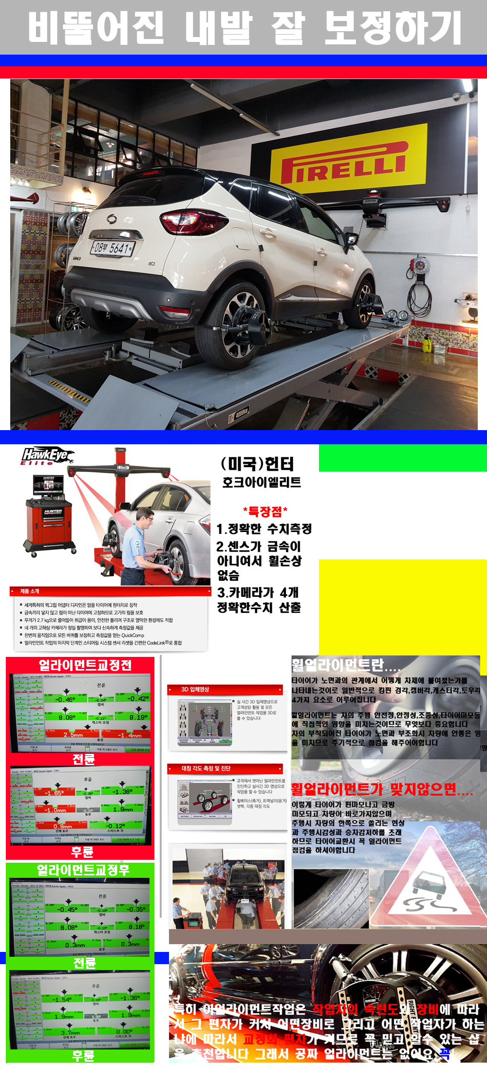 자사는 얼라이먼트정렬시 교정전 교정후를 구분하여 고객님께 직접 이수치값을 확인시켜드리고 작업을 하며 이후 각각의 특성을 가진 타이어들에 대해서 설명 및 관리요령 운전요령 같이 설명해드리고 있습니다