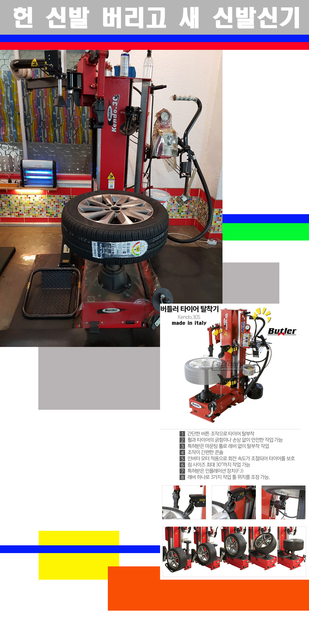 이태리 버틀러사의 켄도3.0S는 휠과 타이어와 조립과 분리시 전혀 제품에 손상을 주지않는 탈착기로 특히 센터락방식이여서 휠의 중앙부위 잡아서 타이어를 탈부착하고 이후 상하롤러로 타이어를 탈부착합니다 특히 유니포미티작업(휠의 가장가벼운부분과 타이어의 가장 무거운부분을 매칭시키는 작업)시 작업자가 타이어를 정확한 지점에 휠과 매칭시킬수 있는 장점도 있습니다