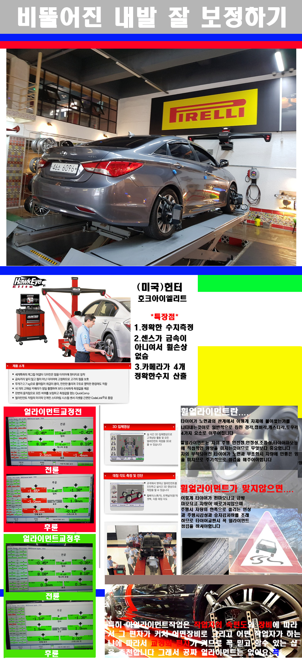 자사는 얼라이먼트정렬시 교정전 교정후를 구분하여 고객님께 직접 이수치값을 확인시켜드리고 작업을 하며 이후 각각의 특성을 가진 타이어들에 대해서 설명 및 관리요령 운전요령 같이 설명해드리고 있습니다