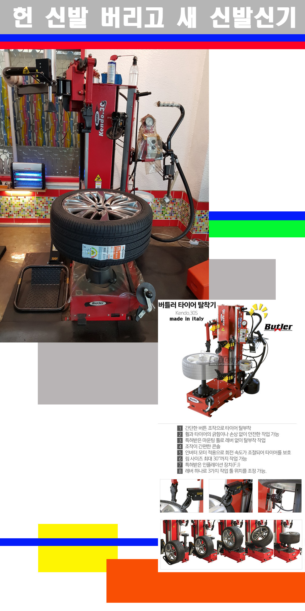 이태리 버틀러사의 켄도3.0S는 휠과 타이어와 조립과 분리시 전혀 제품에 손상을 주지않는 탈착기로 특히 센터락방식이여서 휠의 중앙부위 잡아서 타이어를 탈부착하고 이후 상하롤러로 타이어를 탈부착합니다 특히 유니포미티작업(휠의 가장가벼운부분과 타이어의 가장 무거운부분을 매칭시키는 작업)시 작업자가 타이어를 정확한 지점에 휠과 매칭시킬수 있는 장점도 있습니다