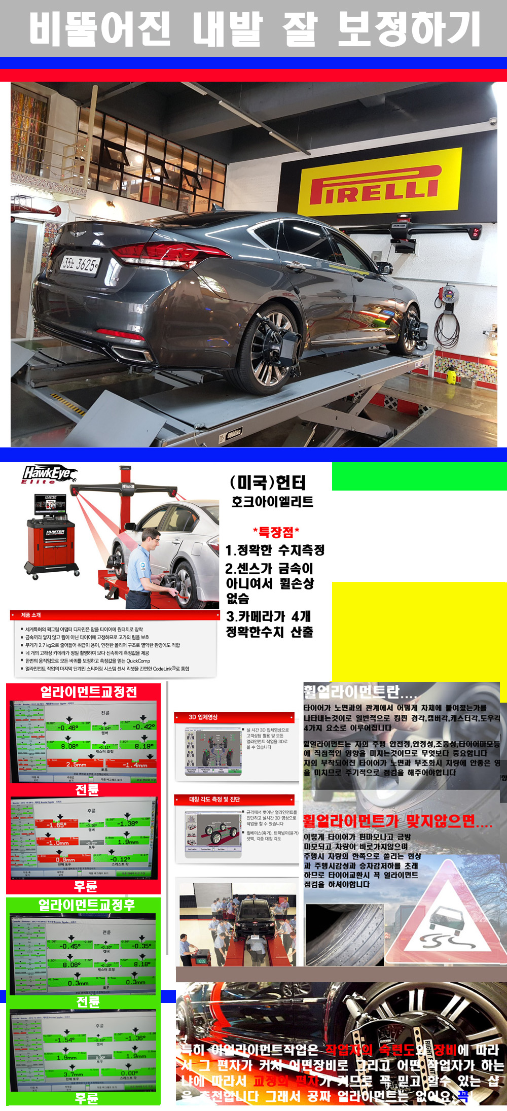 자사는 얼라이먼트정렬시 교정전 교정후를 구분하여 고객님께 직접 이수치값을 확인시켜드리고 작업을 하며 이후 각각의 특성을 가진 타이어들에 대해서 설명 및 관리요령 운전요령 같이 설명해드리고 있습니다