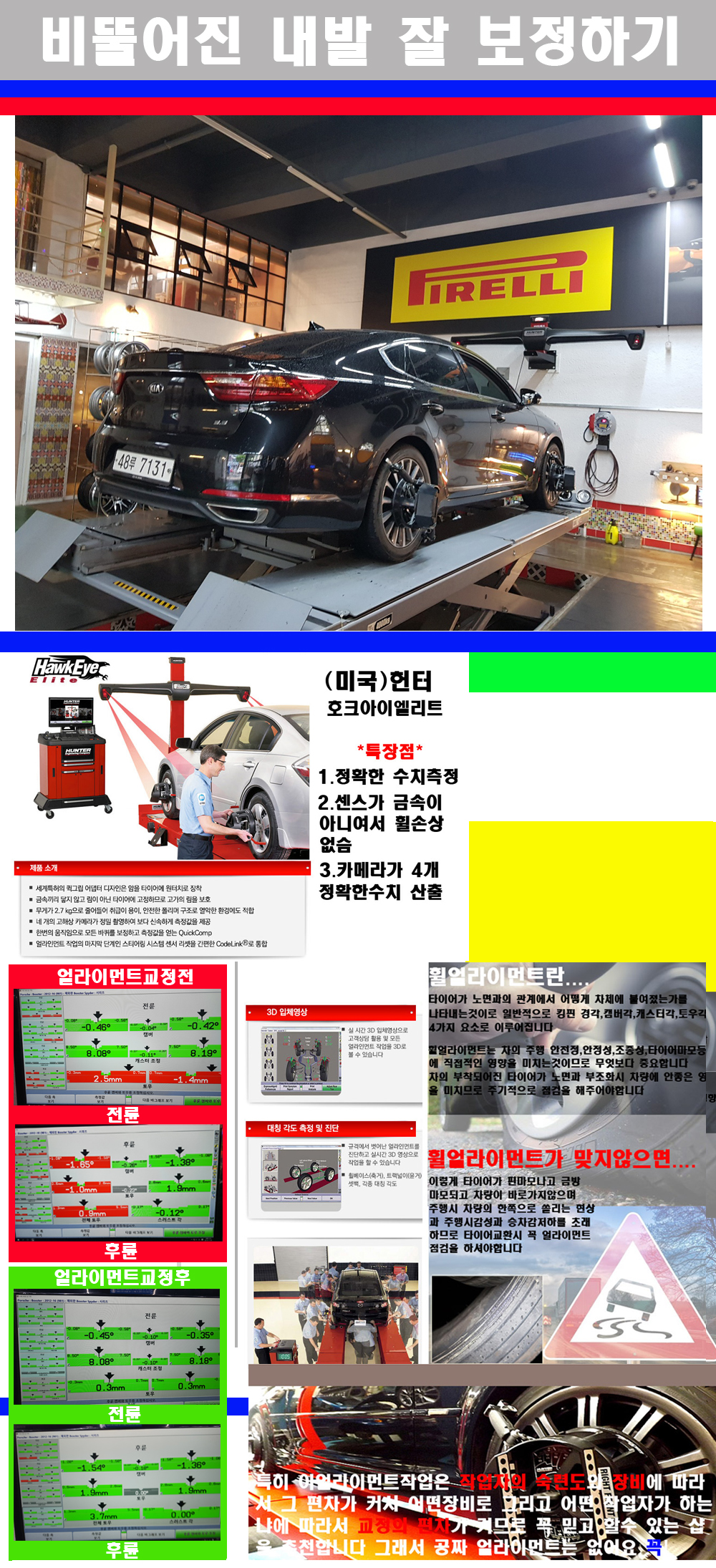 자사는 얼라이먼트정렬시 교정전 교정후를 구분하여 고객님께 직접 이수치값을 확인시켜드리고 작업을 하며 이후 각각의 특성을 가진 타이어들에 대해서 설명 및 관리요령 운전요령 같이 설명해드리고 있습니다