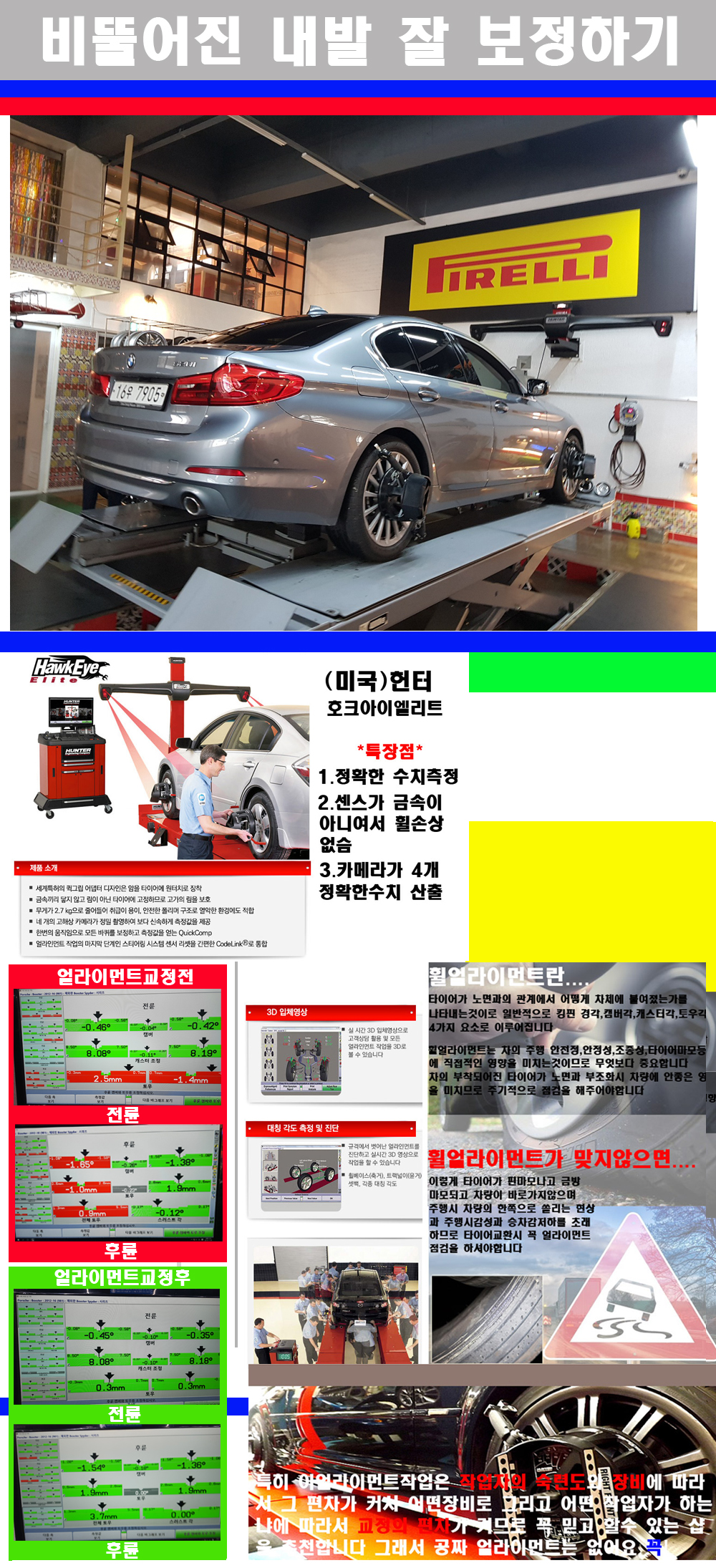 자사는 얼라이먼트정렬시 교정전 교정후를 구분하여 고객님께 직접 이수치값을 확인시켜드리고 작업을 하며 이후 각각의 특성을 가진 타이어들에 대해서 설명 및 관리요령 운전요령 같이 설명해드리고 있습니다