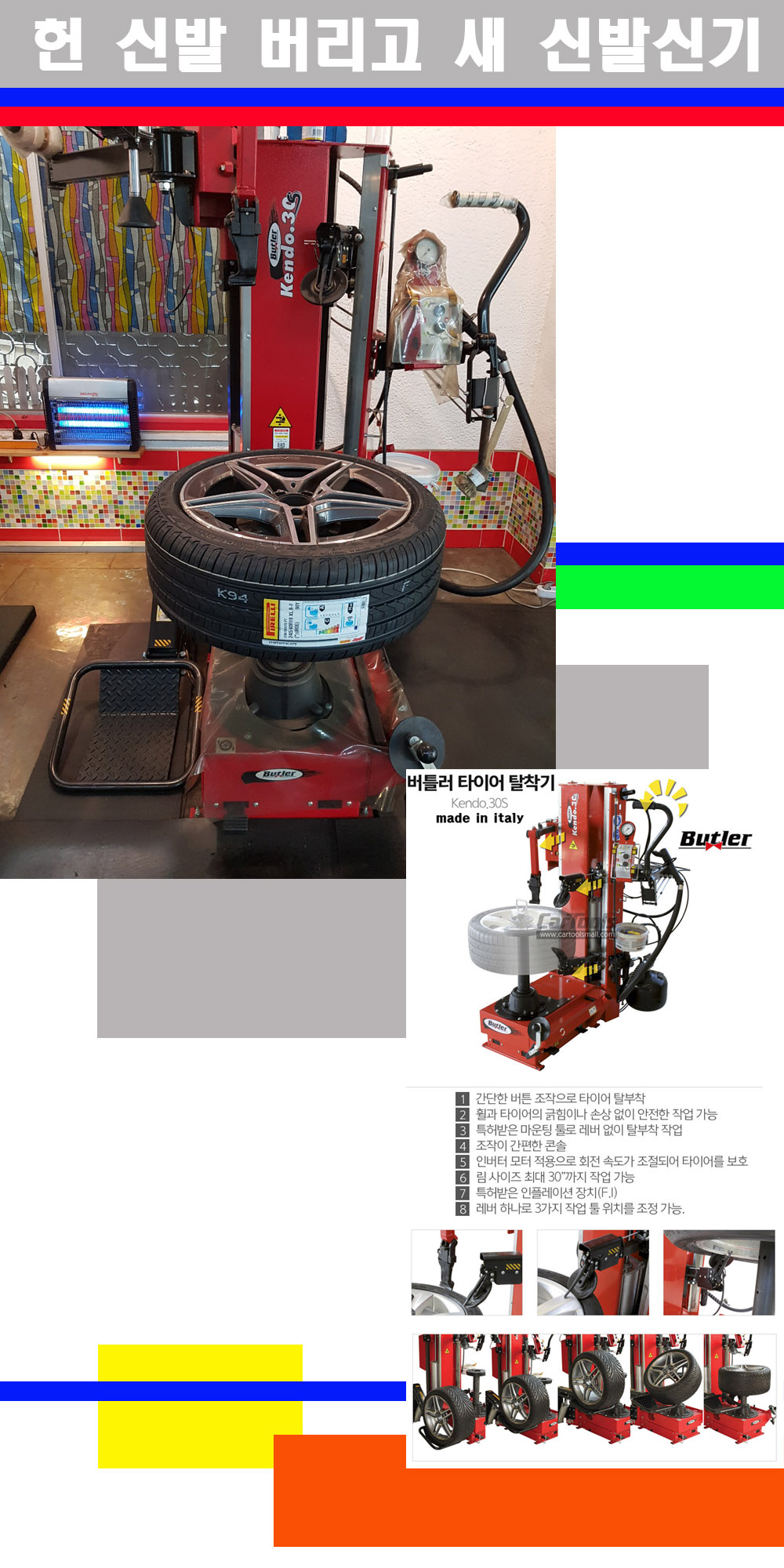 이태리 버틀러사의 켄도3.0S는 휠과 타이어와 조립과 분리시 전혀 제품에 손상을 주지않는 탈착기로 특히 센터락방식이여서 휠의 중앙부위 잡아서 타이어를 탈부착하고 이후 상하롤러로 타이어를 탈부착합니다 특히 유니포미티작업(휠의 가장가벼운부분과 타이어의 가장 무거운부분을 매칭시키는 작업)시 작업자가 타이어를 정확한 지점에 휠과 매칭시킬수 있는 장점도 있습니다