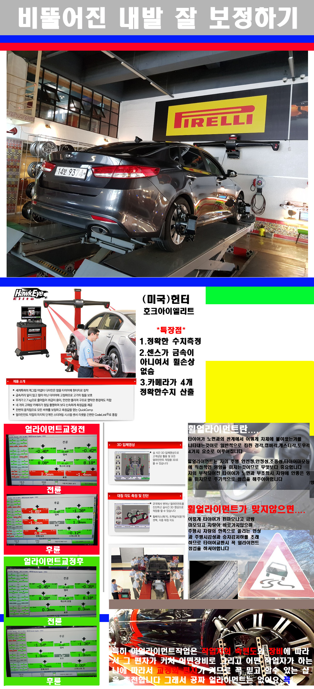 자사는 얼라이먼트정렬시 교정전 교정후를 구분하여 고객님께 직접 이수치값을 확인시켜드리고 작업을 하며 이후 각각의 특성을 가진 타이어들에 대해서 설명 및 관리요령 운전요령 같이 설명해드리고 있습니다