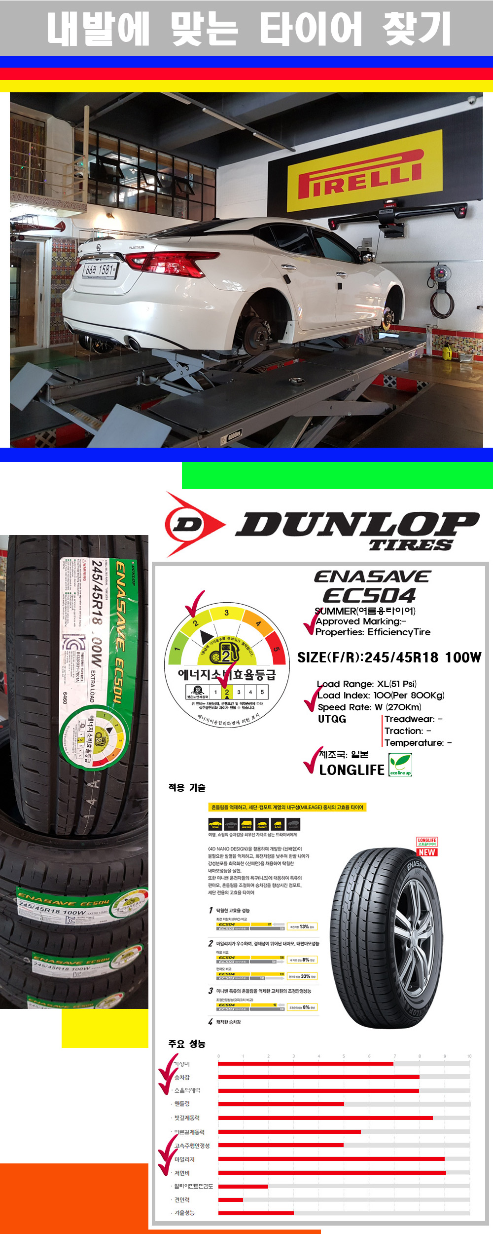 물론 한국 금호 넥센 브리지스톤 미쉐린 콘티넨탈 피렐리 던롭 굳이어 요코하마 등 세계유수의 10대 브랜드타이어만 취급하고 있습니다 타이어매장중 단일규모로는 아마 전국에서 제일 커지않을까 생각합니다 가격도 인터넷 최저가로 장착해 드리고 있습니다 고객님들이 오시면서 너무 고급스러워 가격도 비싸지 않을까 생각하시는데 네이버에서 타이어플러스사이트를 검색해보시면 가격 또한 정말 싸게 판매하고 있구나 하고 생각하실것입니다 자사홈피가격은 장착비 포함가격입니다 물론 장비도 현존하는 장비중 가장 최신장비와 그리고 유럽풍 인테리어의 최고급매장입니다 무엇하나 정품만 취급하며 작업또한 꼼꼼하게 매뉴얼에 따라서 작업을 해드립니다 특히 사장님의 이력이 화려한데 레이스로서 경험한 풍부한 자동차의 지식을 갖춘분이십니다 그래서 사장님께서 직접상담해주시고 장착도 해주시는 매장이기에 더 신뢰가 가지 않을까 생각합니다 자사는 인터넷 최저가 기반으로 성장한 회사이기에 가격또한 인터넷 최저가로 장착해 드리고 있습니다 그리고 자사는 고객만족도에서 대상까지 수상한 회사입니다 그래서 한번 저의 매장에서 작업하신 고객님은 아마 다른곳에서는 아마 눈에 차지 않을것이라 생각합니다 가격이면 가격 작업의 완성도면 완성도 그리고 사후 관리까지 최고중에 최고가 되기위해서 노력하는 매장입니다 지금까지 어느 매장에서도 느끼지 못한 감성들을 느끼시기를 바랍니다 감사합니다 던롭타이어에 대해서 조금 생소하시죠!! 이타이어회사는 영국에 본사를 두고있는 전세계 시장점유률 7위정도하는 회사입니다 물론 지금은 전세계에서 생산하는 다국적 기업입니다 현재는 일본등지에서 OE방식으로 많이 생산되고 있습니다 이던롭타이어는 처음 고무로된 타이어는 완충작용을 하지못해서 던롭이라는 개발자의 아들이 자전거를 타고 가다가 많이 다쳐서 안락하고 승차감있는 타이어를 만들기 위해서 공기를 주입하는 튜브식 타이어를 만든 사람이 던롭입니다 물론 이분은 의사입니다 그래서 그런지 여러 사용상의 필요에 의해서 많이 관철하고 어떤 타이어가 좋은지에 대해서 연구를 많이 해서 만들어진 타이어가 최초의 공기 충전식 타이어이며 그후 대량생산하게 된 회사가 던롭타이어입니다 물론 이회사는 일본차종 및 독일차종에 순정품으로 장착이 되는 타이어이며 순정품이후 대체시장용(RE)으로 현재는 LM704 EC504 EC204등 여러가지 패턴들이 공급되고 있습니다 전반적으로 RE용타이어들을 보면 에너지 효율이 높고 배수성능이 좋은 여름용타이어를 주력으로 공급하고 있습니다 일본에서 생산되는 던롭타이어들의 특성들은 승차감이 좋고 소음억제력이 좋다입니다 그리고 시장에 공략하는 가격도 착해서 한번쯤 장착을 권장하고 싶은 제품들입니다 참고로 타이어의 본래의 특성을 지닌 타이어는 여름용타이어입니다 부드러워서 승차감이 좋고 커프와 사이프와 핀수가 적어 소음억제력이 좋으며 잘서고 잘달리며 잘돕니다 하지만 수명이 4계절용타이어에 비해서 20~30%정도 짧으며 결빙된 노면에서 제동거리가 조금 더길다는 단점이 있습니다 그렇다고 겨울에 여름용타이어를 사용하지 말라는 것은 아닙니다 영상7도씨 밑에서의 타이어 딱딱해지는 경화성은 4계절용타이어나 여름용타이어 모두 가지는 단점이기에 겨울철에는 겨울용타이어를 장착하시는 것이 가장좋은 방법입니다 이제품은 비오는날 제동거리가 4계절용타이어보다 30%정도 짧으며 특히 마른길 노면에서의 제동거리가 20~33%정도 짧아지며 소음억제력과 승차감구현력이 좋아 한국정서에 잘맞는 제품입니다 한번쯤 장착을 권장해드립니다 찾아주셔서 감사합니다