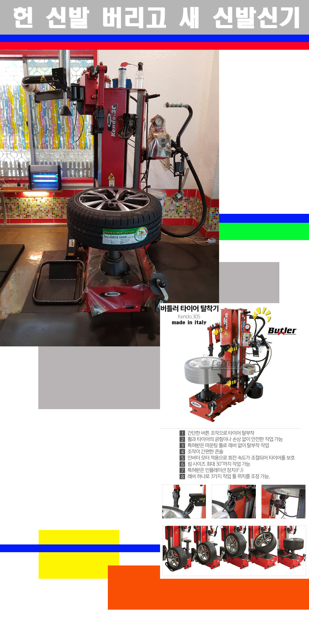 이태리 버틀러사의 켄도3.0S는 휠과 타이어와 조립과 분리시 전혀 제품에 손상을 주지않는 탈착기로 특히 센터락방식이여서 휠의 중앙부위 잡아서 타이어를 탈부착하고 이후 상하롤러로 타이어를 탈부착합니다 특히 유니포미티작업(휠의 가장가벼운부분과 타이어의 가장 무거운부분을 매칭시키는 작업)시 작업자가 타이어를 정확한 지점에 휠과 매칭시킬수 있는 장점도 있습니다