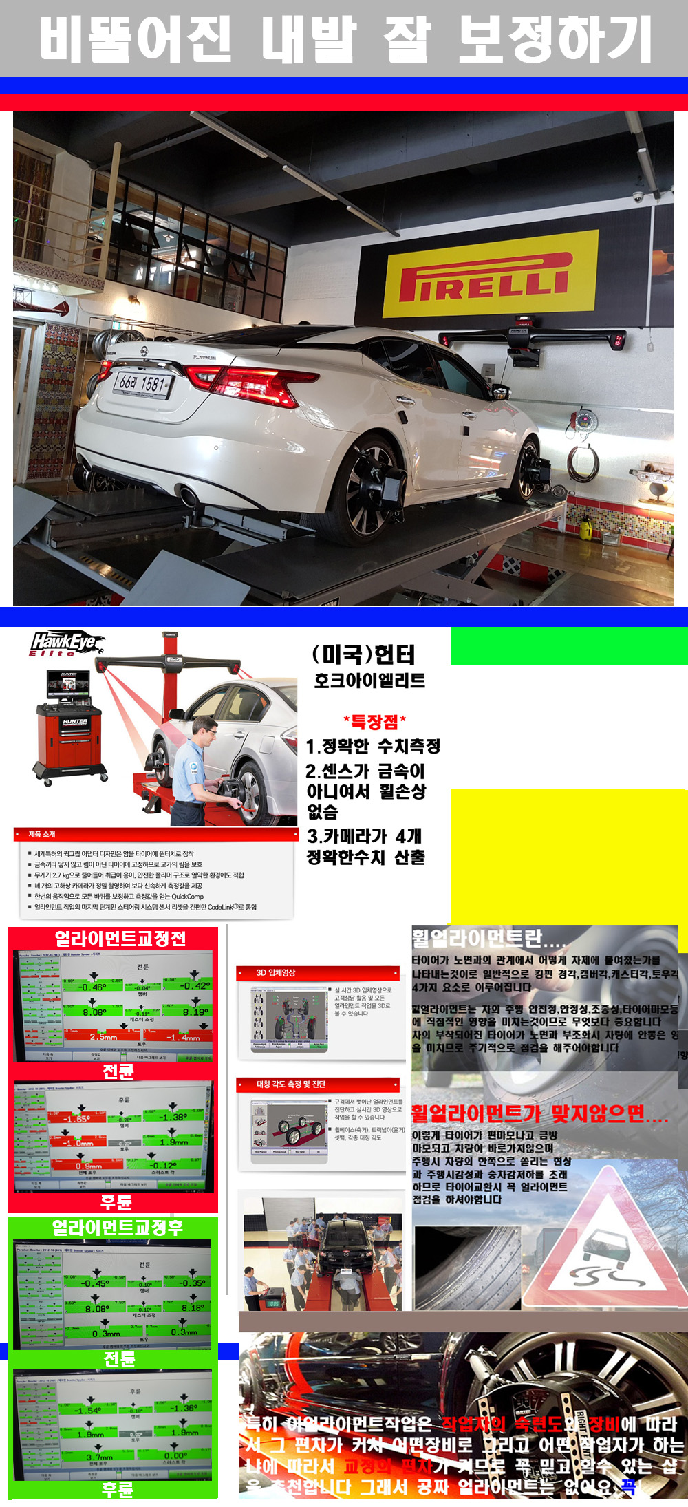 자사는 얼라이먼트정렬시 교정전 교정후를 구분하여 고객님께 직접 이수치값을 확인시켜드리고 작업을 하며 이후 각각의 특성을 가진 타이어들에 대해서 설명 및 관리요령 운전요령 같이 설명해드리고 있습니다