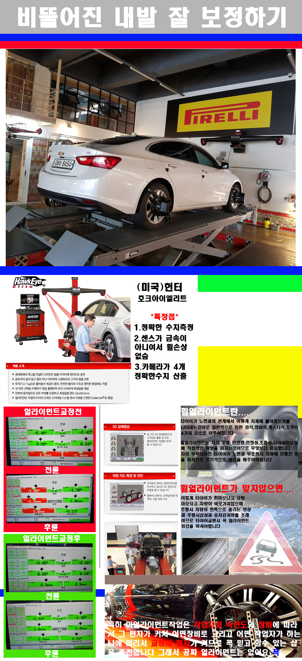 자사는 얼라이먼트정렬시 교정전 교정후를 구분하여 고객님께 직접 이수치값을 확인시켜드리고 작업을 하며 이후 각각의 특성을 가진 타이어들에 대해서 설명 및 관리요령 운전요령 같이 설명해드리고 있습니다