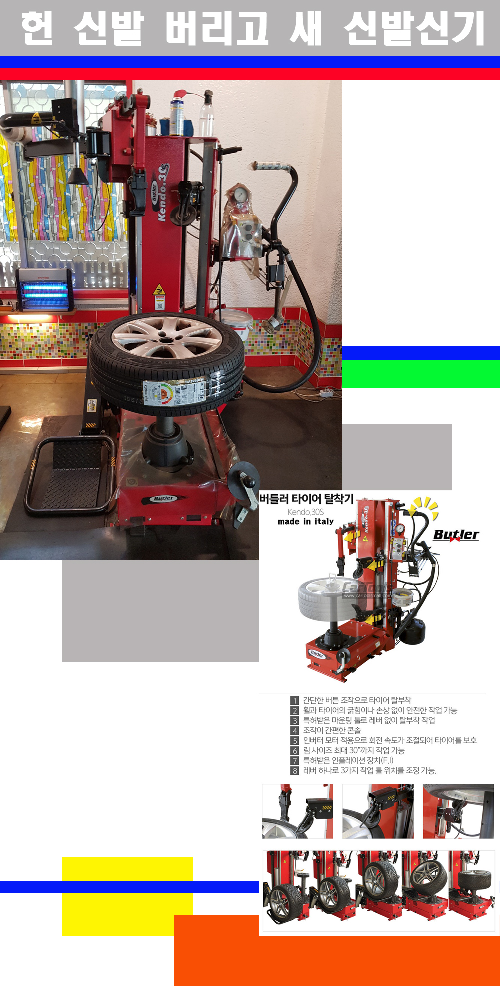 이태리 버틀러사의 켄도3.0S는 휠과 타이어와 조립과 분리시 전혀 제품에 손상을 주지않는 탈착기로 특히 센터락방식이여서 휠의 중앙부위 잡아서 타이어를 탈부착하고 이후 상하롤러로 타이어를 탈부착합니다 특히 유니포미티작업(휠의 가장가벼운부분과 타이어의 가장 무거운부분을 매칭시키는 작업)시 작업자가 타이어를 정확한 지점에 휠과 매칭시킬수 있는 장점도 있습니다