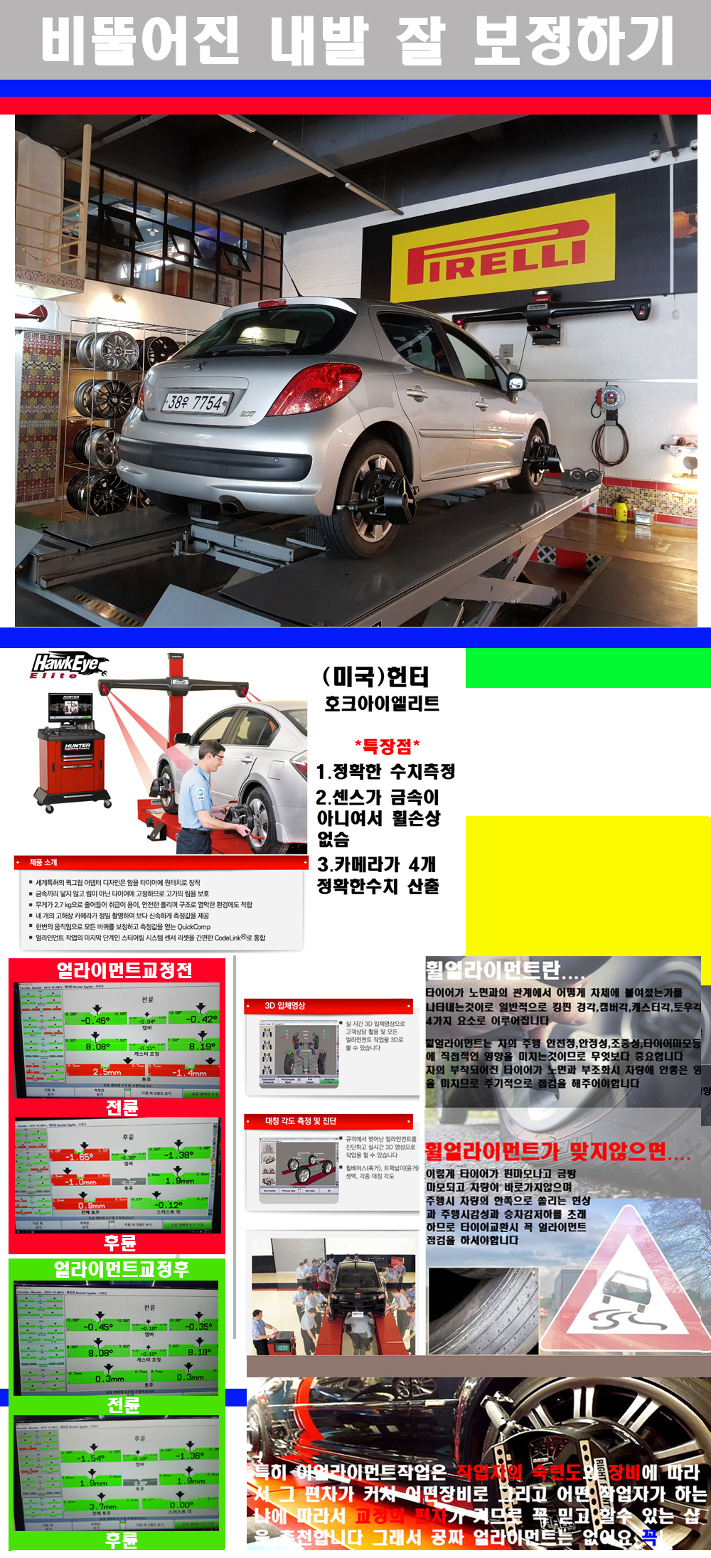 자사는 얼라이먼트정렬시 교정전 교정후를 구분하여 고객님께 직접 이수치값을 확인시켜드리고 작업을 하며 이후 각각의 특성을 가진 타이어들에 대해서 설명 및 관리요령 운전요령 같이 설명해드리고 있습니다
