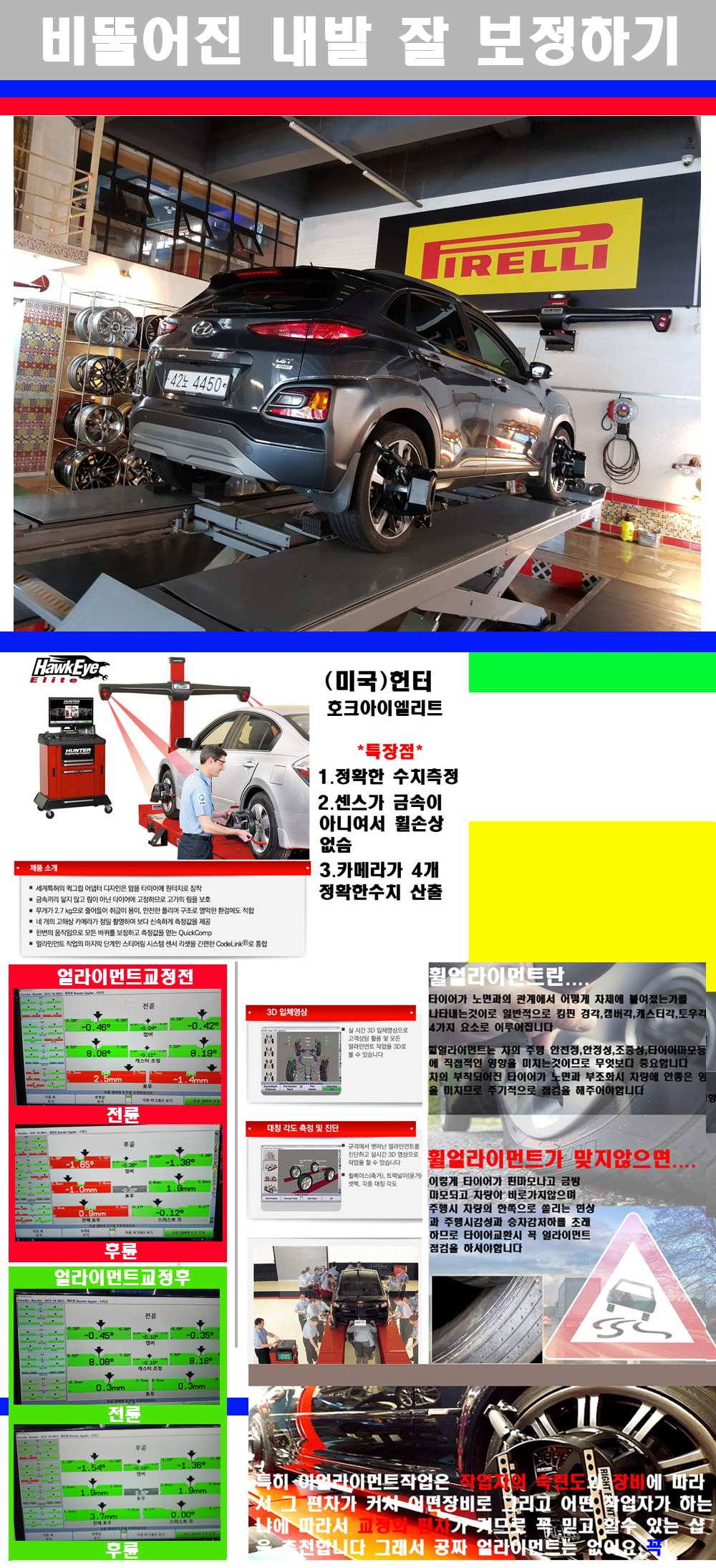 자사는 얼라이먼트정렬시 교정전 교정후를 구분하여 고객님께 직접 이수치값을 확인시켜드리고 작업을 하며 이후 각각의 특성을 가진 타이어들에 대해서 설명 및 관리요령 운전요령 같이 설명해드리고 있습니다