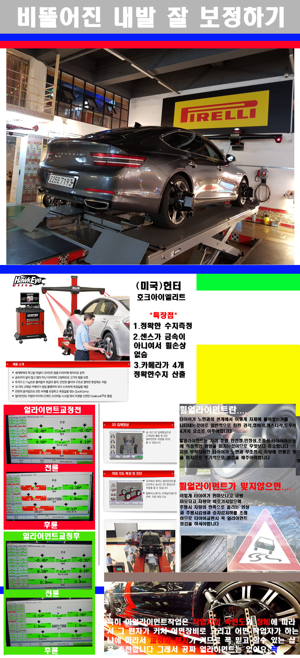자사는 얼라이먼트정렬시 교정전 교정후를 구분하여 고객님께 직접 이수치값을 확인시켜드리고 작업을 하며 이후 각각의 특성을 가진 타이어들에 대해서 설명 및 관리요령 운전요령 같이 설명해드리고 있습니다