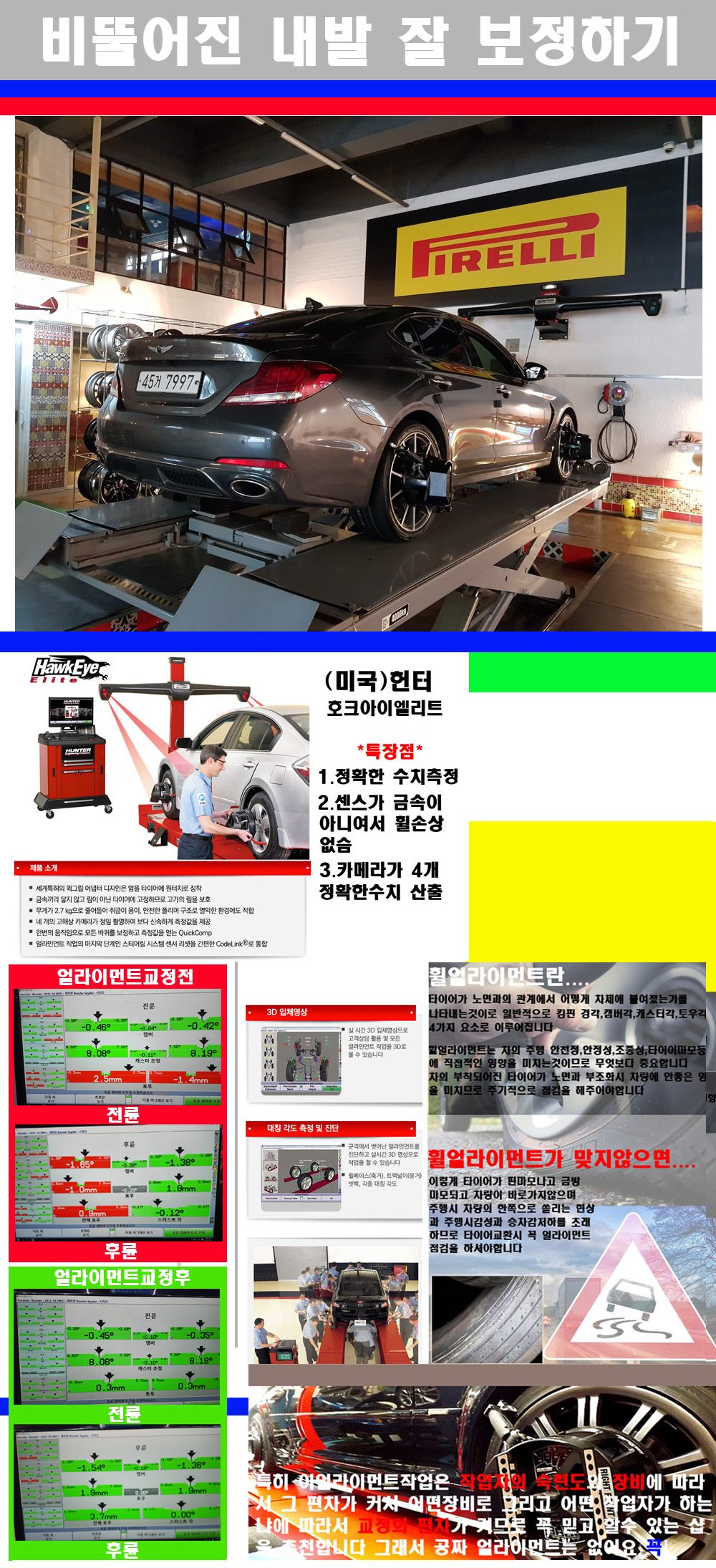 자사는 얼라이먼트정렬시 교정전 교정후를 구분하여 고객님께 직접 이수치값을 확인시켜드리고 작업을 하며 이후 각각의 특성을 가진 타이어들에 대해서 설명 및 관리요령 운전요령 같이 설명해드리고 있습니다