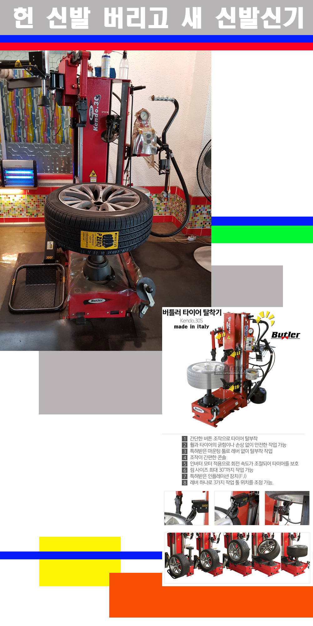 이태리 버틀러사의 켄도3.0S는 휠과 타이어와 조립과 분리시 전혀 제품에 손상을 주지않는 탈착기로 특히 센터락방식이여서 휠의 중앙부위 잡아서 타이어를 탈부착하고 이후 상하롤러로 타이어를 탈부착합니다 특히 유니포미티작업(휠의 가장가벼운부분과 타이어의 가장 무거운부분을 매칭시키는 작업)시 작업자가 타이어를 정확한 지점에 휠과 매칭시킬수 있는 장점도 있습니다