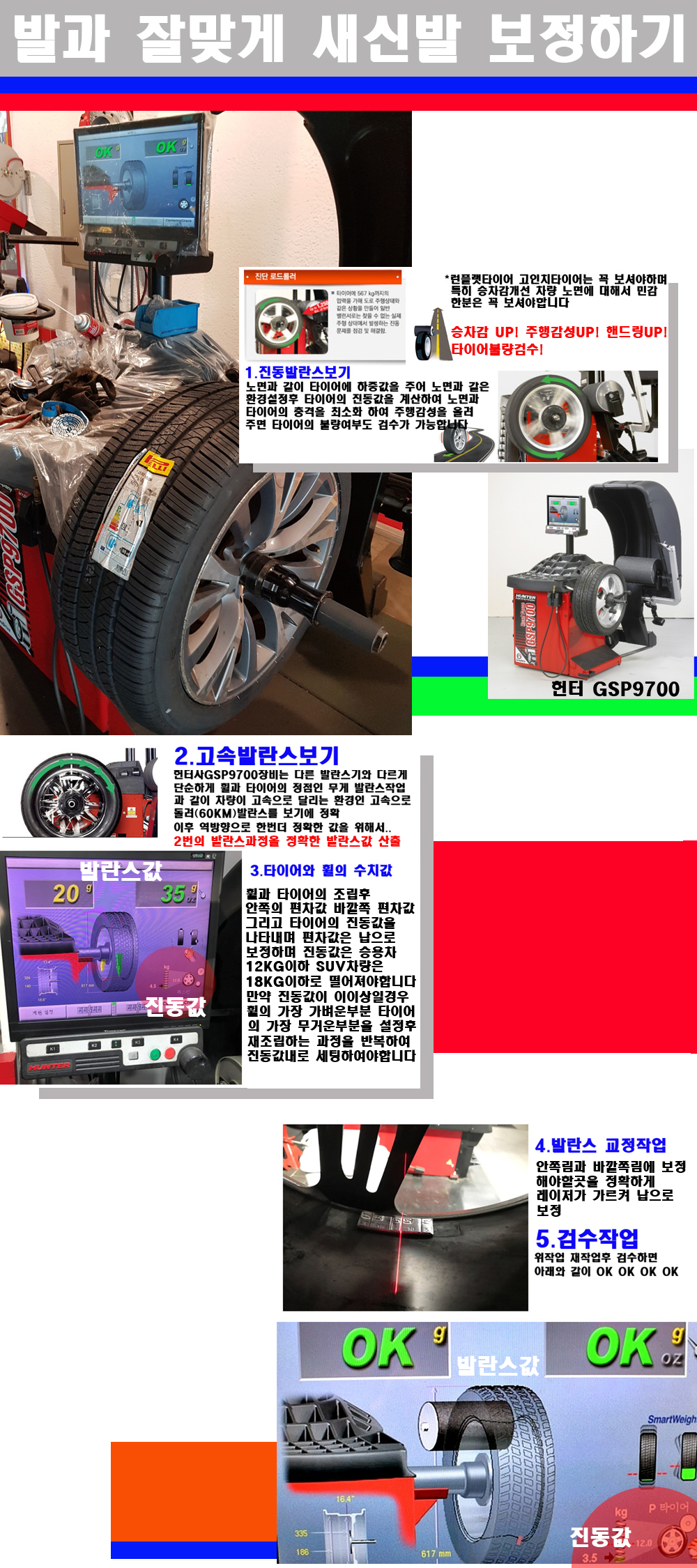 이장비는 노면에서 올라오는 진동값까지 계산하여 발란스값을 보는 방식으로 진동발란스기는 헌터사GSP9700장비가 유일합니다 이후 역방향으로 60키로의 고속으로 다시 발란스값을 보정하는 방식입니다