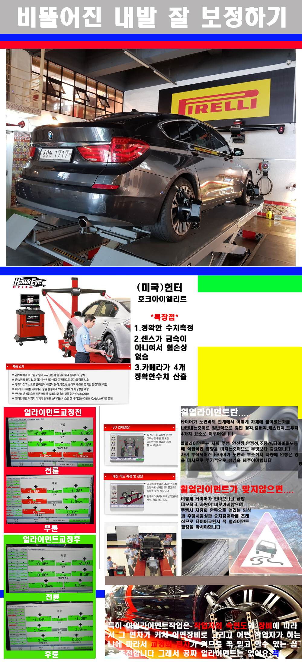 자사는 얼라이먼트정렬시 교정전 교정후를 구분하여 고객님께 직접 이수치값을 확인시켜드리고 작업을 하며 이후 각각의 특성을 가진 타이어들에 대해서 설명 및 관리요령 운전요령 같이 설명해드리고 있습니다