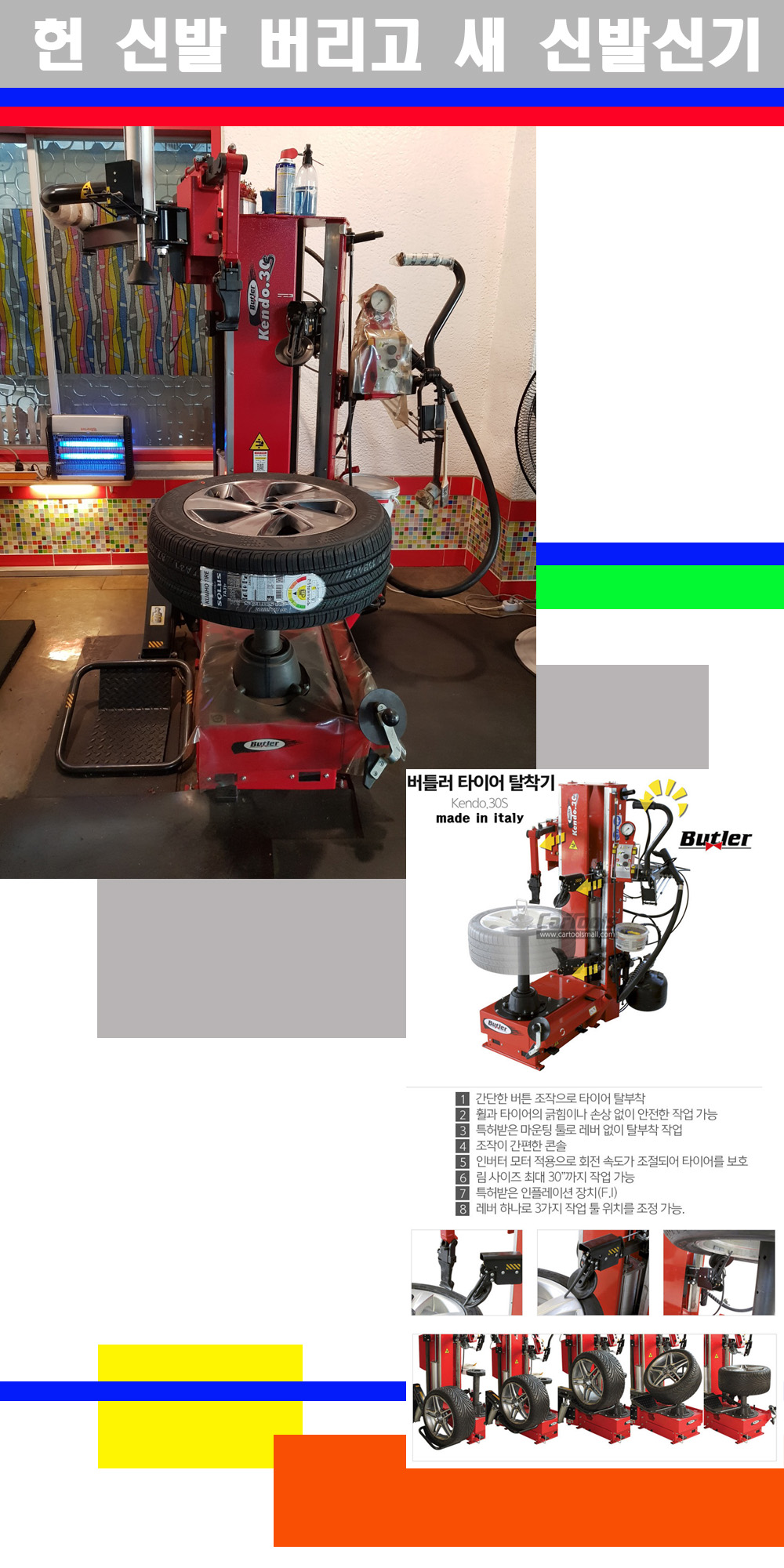 이태리 버틀러사의 켄도3.0S는 휠과 타이어와 조립과 분리시 전혀 제품에 손상을 주지않는 탈착기로 특히 센터락방식이여서 휠의 중앙부위 잡아서 타이어를 탈부착하고 이후 상하롤러로 타이어를 탈부착합니다 특히 유니포미티작업(휠의 가장가벼운부분과 타이어의 가장 무거운부분을 매칭시키는 작업)시 작업자가 타이어를 정확한 지점에 휠과 매칭시킬수 있는 장점도 있습니다