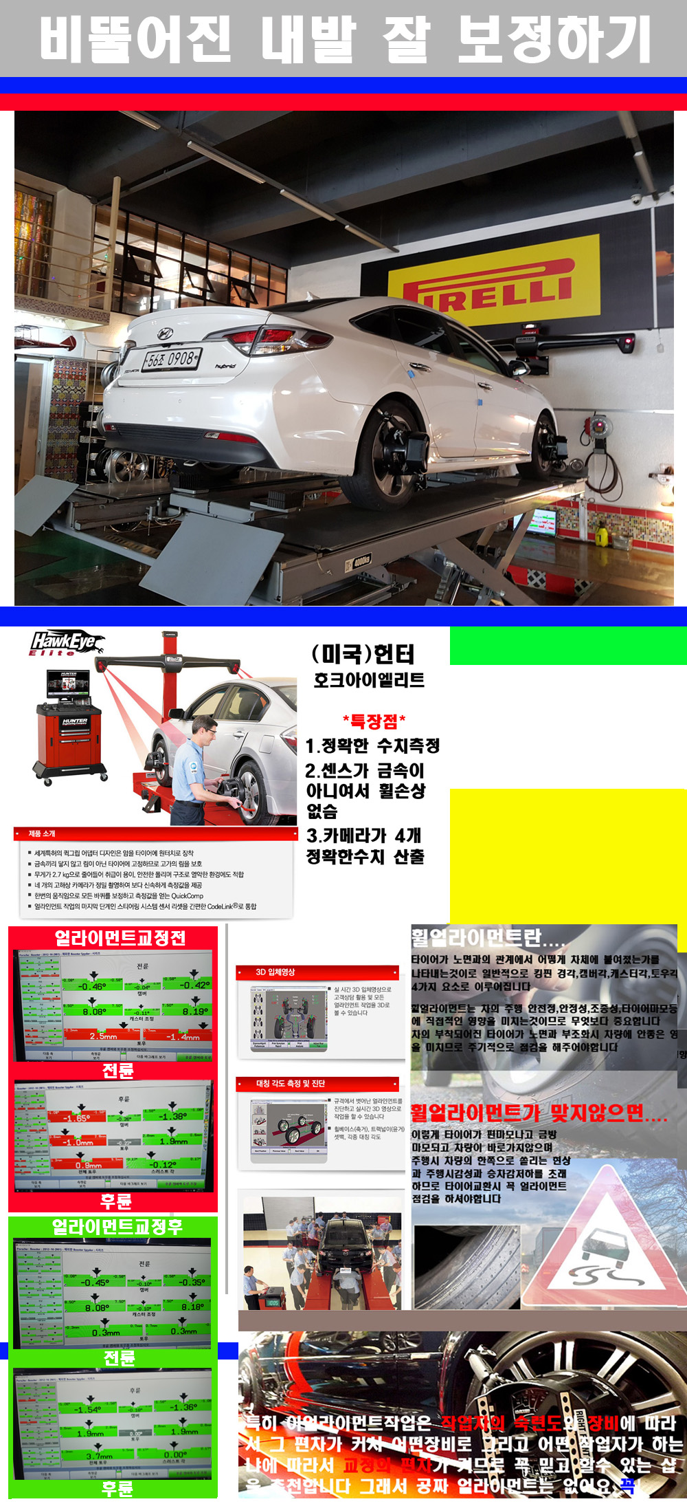 자사는 얼라이먼트정렬시 교정전 교정후를 구분하여 고객님께 직접 이수치값을 확인시켜드리고 작업을 하며 이후 각각의 특성을 가진 타이어들에 대해서 설명 및 관리요령 운전요령 같이 설명해드리고 있습니다