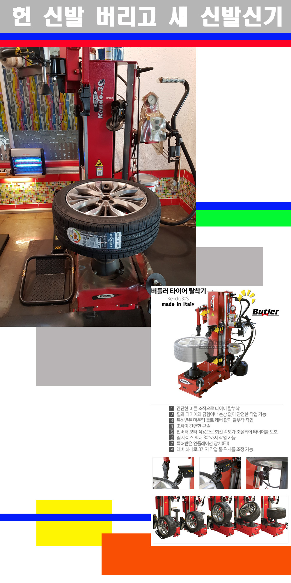 이태리 버틀러사의 켄도3.0S는 휠과 타이어와 조립과 분리시 전혀 제품에 손상을 주지않는 탈착기로 특히 센터락방식이여서 휠의 중앙부위 잡아서 타이어를 탈부착하고 이후 상하롤러로 타이어를 탈부착합니다 특히 유니포미티작업(휠의 가장가벼운부분과 타이어의 가장 무거운부분을 매칭시키는 작업)시 작업자가 타이어를 정확한 지점에 휠과 매칭시킬수 있는 장점도 있습니다