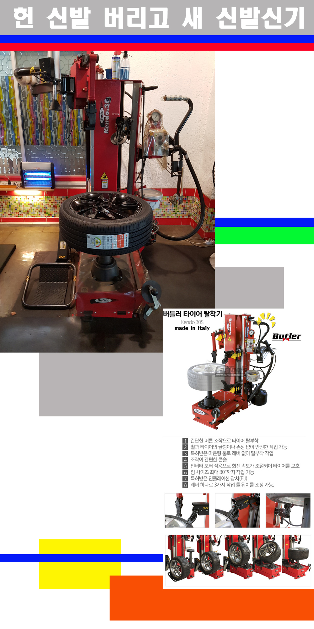 이태리 버틀러사의 켄도3.0S는 휠과 타이어와 조립과 분리시 전혀 제품에 손상을 주지않는 탈착기로 특히 센터락방식이여서 휠의 중앙부위 잡아서 타이어를 탈부착하고 이후 상하롤러로 타이어를 탈부착합니다 특히 유니포미티작업(휠의 가장가벼운부분과 타이어의 가장 무거운부분을 매칭시키는 작업)시 작업자가 타이어를 정확한 지점에 휠과 매칭시킬수 있는 장점도 있습니다