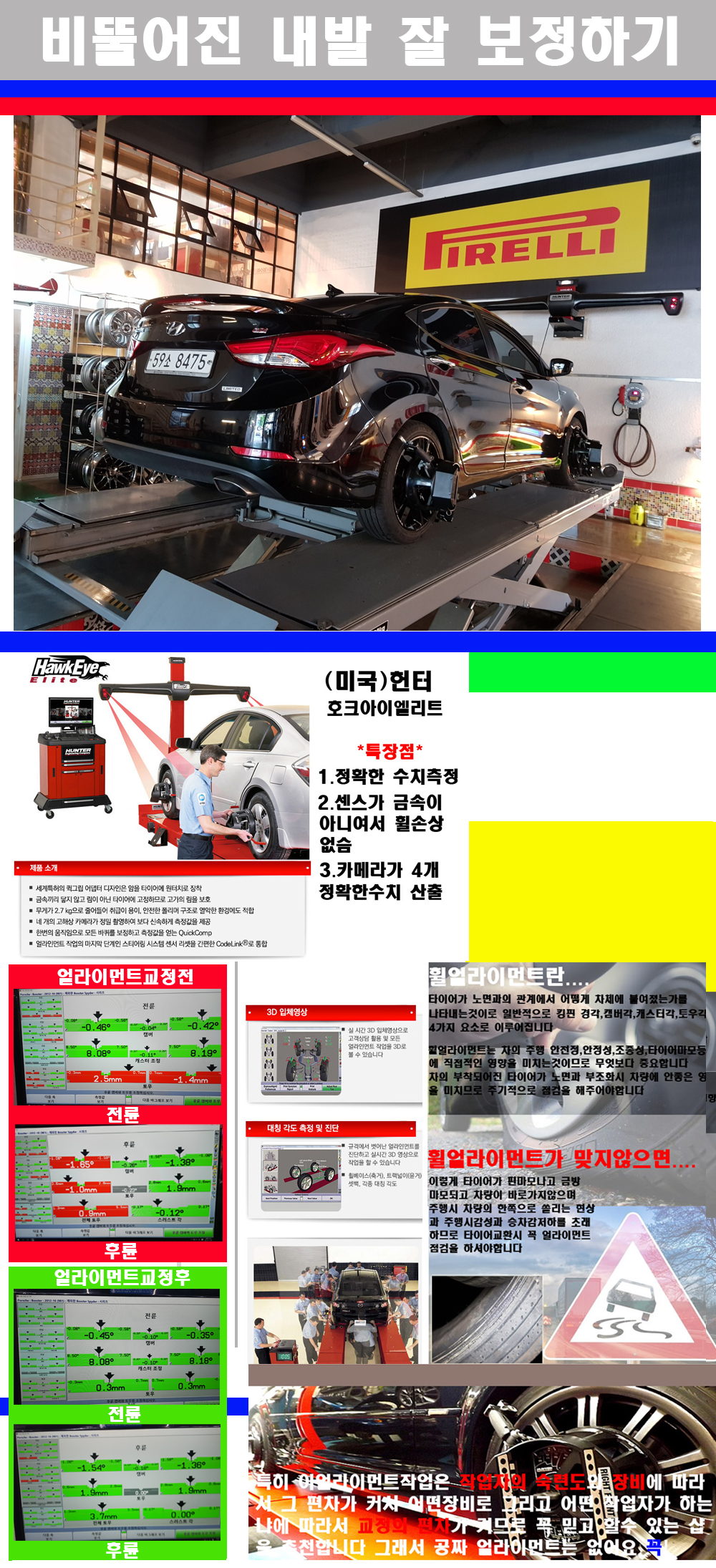 자사는 얼라이먼트정렬시 교정전 교정후를 구분하여 고객님께 직접 이수치값을 확인시켜드리고 작업을 하며 이후 각각의 특성을 가진 타이어들에 대해서 설명 및 관리요령 운전요령 같이 설명해드리고 있습니다