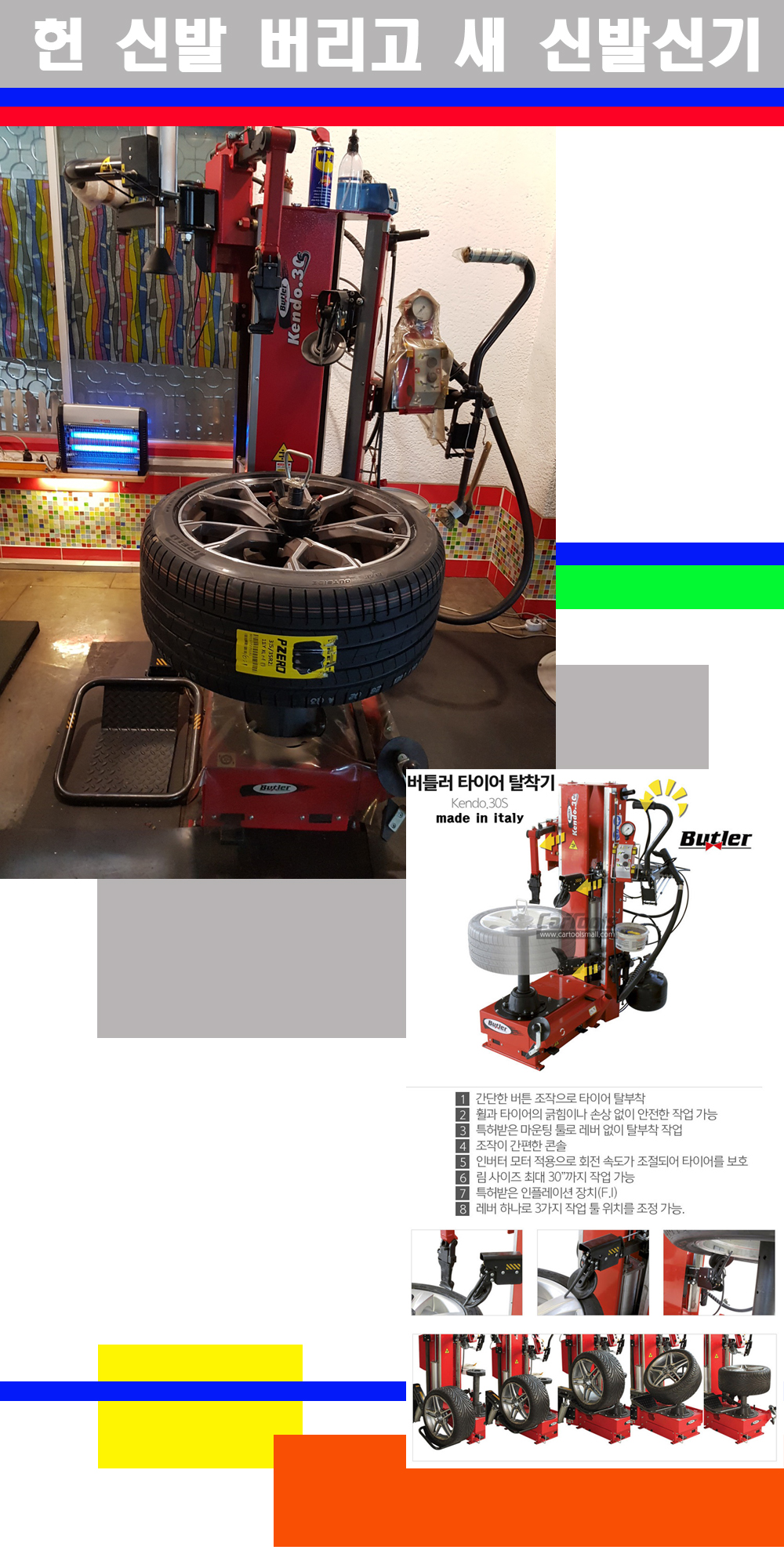 이태리 버틀러사의 켄도3.0S는 휠과 타이어와 조립과 분리시 전혀 제품에 손상을 주지않는 탈착기로 특히 센터락방식이여서 휠의 중앙부위 잡아서 타이어를 탈부착하고 이후 상하롤러로 타이어를 탈부착합니다 특히 유니포미티작업(휠의 가장가벼운부분과 타이어의 가장 무거운부분을 매칭시키는 작업)시 작업자가 타이어를 정확한 지점에 휠과 매칭시킬수 있는 장점도 있습니다