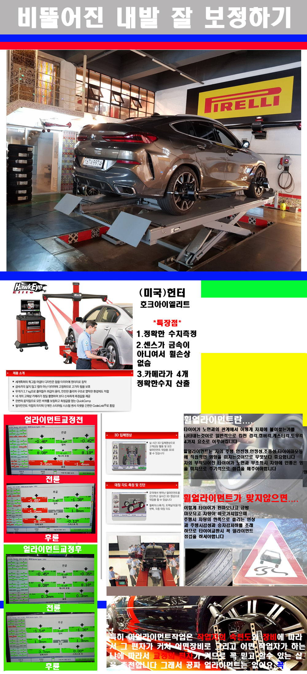 자사는 얼라이먼트정렬시 교정전 교정후를 구분하여 고객님께 직접 이수치값을 확인시켜드리고 작업을 하며 이후 각각의 특성을 가진 타이어들에 대해서 설명 및 관리요령 운전요령 같이 설명해드리고 있습니다