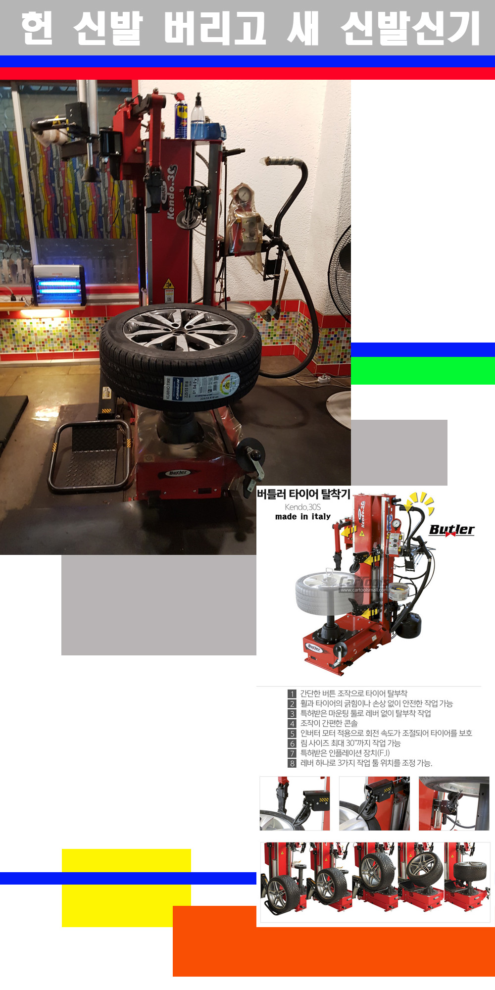 이태리 버틀러사의 켄도3.0S는 휠과 타이어와 조립과 분리시 전혀 제품에 손상을 주지않는 탈착기로 특히 센터락방식이여서 휠의 중앙부위 잡아서 타이어를 탈부착하고 이후 상하롤러로 타이어를 탈부착합니다 특히 유니포미티작업(휠의 가장가벼운부분과 타이어의 가장 무거운부분을 매칭시키는 작업)시 작업자가 타이어를 정확한 지점에 휠과 매칭시킬수 있는 장점도 있습니다