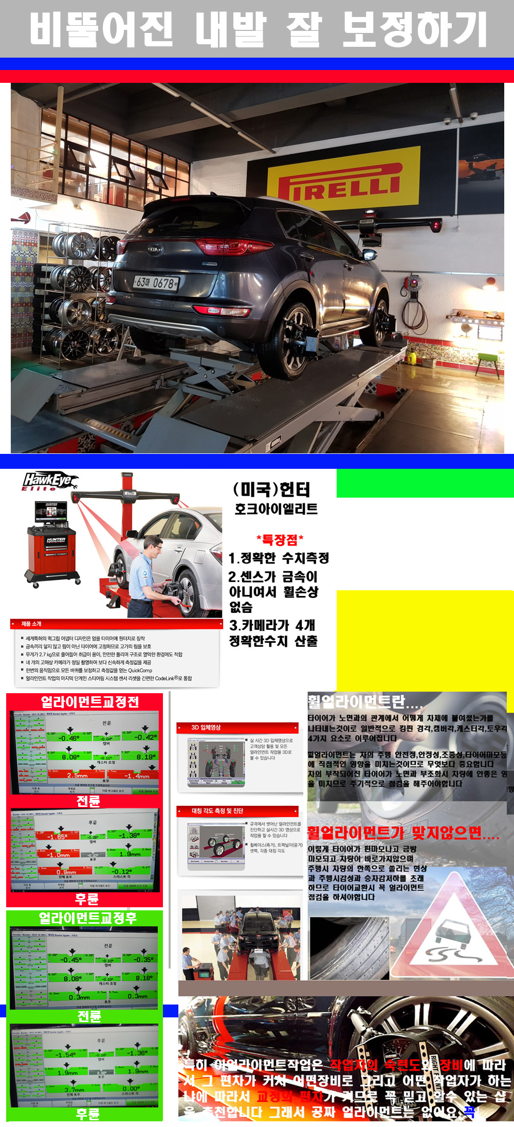 자사는 얼라이먼트정렬시 교정전 교정후를 구분하여 고객님께 직접 이수치값을 확인시켜드리고 작업을 하며 이후 각각의 특성을 가진 타이어들에 대해서 설명 및 관리요령 운전요령 같이 설명해드리고 있습니다