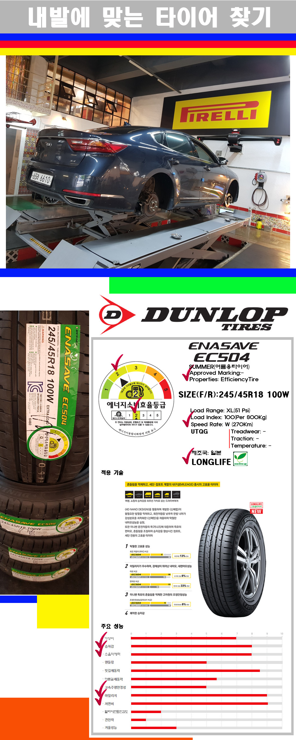 물론 한국 금호 넥센 브리지스톤 미쉐린 콘티넨탈 피렐리 던롭 굳이어 요코하마 등 세계유수의 10대 브랜드타이어만 취급하고 있습니다 타이어매장중 단일규모로는 아마 전국에서 제일 커지않을까 생각합니다 가격도 인터넷 최저가로 장착해 드리고 있습니다 고객님들이 오시면서 너무 고급스러워 가격도 비싸지 않을까 생각하시는데 네이버에서 타이어플러스사이트를 검색해보시면 가격 또한 정말 싸게 판매하고 있구나 하고 생각하실것입니다 자사홈피가격은 장착비 포함가격입니다 물론 장비도 현존하는 장비중 가장 최신장비와 그리고 유럽풍 인테리어의 최고급매장입니다 무엇하나 정품만 취급하며 작업또한 꼼꼼하게 매뉴얼에 따라서 작업을 해드립니다 특히 사장님의 이력이 화려한데 레이스로서 경험한 풍부한 자동차의 지식을 갖춘분이십니다 그래서 사장님께서 직접상담해주시고 장착도 해주시는 매장이기에 더 신뢰가 가지 않을까 생각합니다 자사는 인터넷 최저가 기반으로 성장한 회사이기에 가격또한 인터넷 최저가로 장착해 드리고 있습니다 그리고 자사는 고객만족도에서 대상까지 수상한 회사입니다 그래서 한번 저의 매장에서 작업하신 고객님은 아마 다른곳에서는 아마 눈에 차지 않을것이라 생각합니다 가격이면 가격 작업의 완성도면 완성도 그리고 사후 관리까지 최고중에 최고가 되기위해서 노력하는 매장입니다 지금까지 어느 매장에서도 느끼지 못한 감성들을 느끼시기를 바랍니다 감사합니다 던롭타이어에 대해서 조금 생소하시죠!! 이타이어회사는 영국에 본사를 두고있는 전세계 시장점유률 7위정도하는 회사입니다 물론 지금은 전세계에서 생산하는 다국적 기업입니다 현재는 일본등지에서 OE방식으로 많이 생산되고 있습니다 이던롭타이어는 처음 고무로된 타이어는 완충작용을 하지못해서 던롭이라는 개발자의 아들이 자전거를 타고 가다가 많이 다쳐서 안락하고 승차감있는 타이어를 만들기 위해서 공기를 주입하는 튜브식 타이어를 만든 사람이 던롭입니다 물론 이분은 의사입니다 그래서 그런지 여러 사용상의 필요에 의해서 많이 관철하고 어떤 타이어가 좋은지에 대해서 연구를 많이 해서 만들어진 타이어가 최초의 공기 충전식 타이어이며 그후 대량생산하게 된 회사가 던롭타이어입니다 물론 이회사는 일본차종 및 독일차종에 순정품으로 장착이 되는 타이어이며 순정품이후 대체시장용(RE)으로 현재는 LM704 EC504 EC204등 여러가지 패턴들이 공급되고 있습니다 전반적으로 RE용타이어들을 보면 에너지 효율이 높고 배수성능이 좋은 여름용타이어를 주력으로 공급하고 있습니다 일본에서 생산되는 던롭타이어들의 특성들은 승차감이 좋고 소음억제력이 좋다입니다 그리고 시장에 공략하는 가격도 착해서 한번쯤 장착을 권장하고 싶은 제품들입니다 참고로 타이어의 본래의 특성을 지닌 타이어는 여름용타이어입니다 부드러워서 승차감이 좋고 커프와 사이프와 핀수가 적어 소음억제력이 좋으며 잘서고 잘달리며 잘돕니다 하지만 수명이 4계절용타이어에 비해서 20~30%정도 짧으며 결빙된 노면에서 제동거리가 조금 더길다는 단점이 있습니다 그렇다고 겨울에 여름용타이어를 사용하지 말라는 것은 아닙니다 영상7도씨 밑에서의 타이어 딱딱해지는 경화성은 4계절용타이어나 여름용타이어 모두 가지는 단점이기에 겨울철에는 겨울용타이어를 장착하시는 것이 가장좋은 방법입니다 이제품은 비오는날 제동거리가 4계절용타이어보다 30%정도 짧으며 특히 마른길 노면에서의 제동거리가 20~33%정도 짧아지며 소음억제력과 승차감구현력이 좋아 한국정서에 잘맞는 제품입니다 한번쯤 장착을 권장해드립니다 찾아주셔서 감사합니다