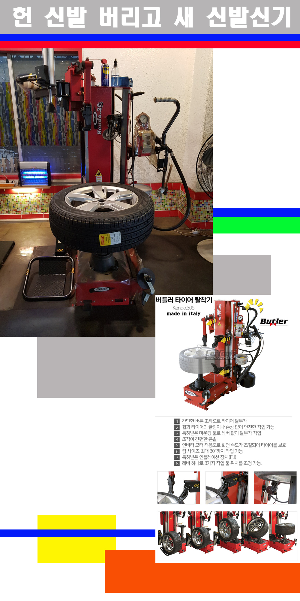 이태리 버틀러사의 켄도3.0S는 휠과 타이어와 조립과 분리시 전혀 제품에 손상을 주지않는 탈착기로 특히 센터락방식(중앙에서 휠를 고정하는 방식)이여서 휠의 중앙부위 잡아서 타이어를 탈부착하고 이후 상하롤러로 타이어를 탈부착합니다 특히 유니포미티작업(휠의 가장가벼운부분과 타이어의 가장 무거운부분을 매칭시키는 작업)시 작업자가 타이어를 정확한 지점에 휠과 매칭시킬수 있는 장점도 있습니다