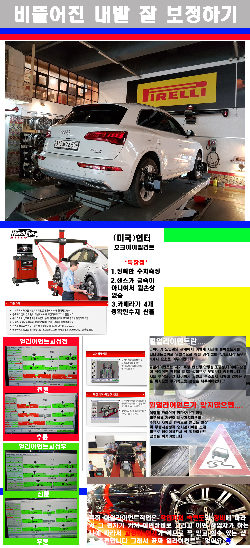 자사는 얼라이먼트정렬시 교정전 교정후를 구분하여 고객님께 직접 이수치값을 확인시켜드리고 작업을 하며 이후 각각의 특성을 가진 타이어들에 대해서 설명 및 관리요령 운전요령 같이 설명해드리고 있습니다
