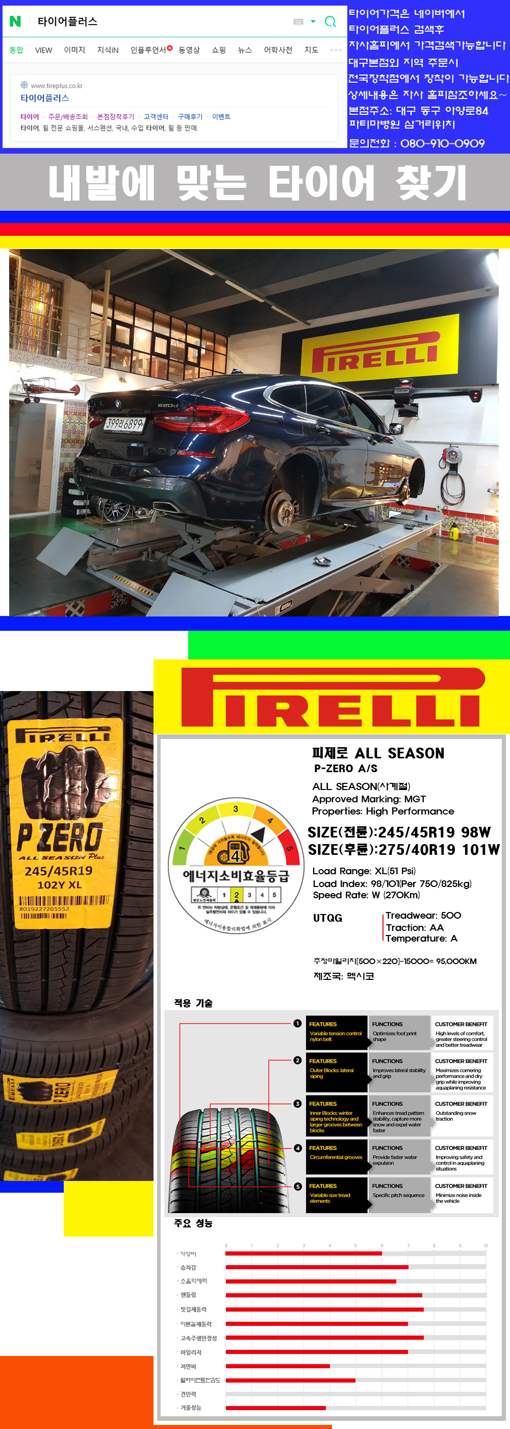 ♥♥♥본점 대구 동구 아양로84 (파티마삼거리 위치) 국산 수입타이어 할인행사중♥♥♥ 타이어플러스 대구본점은 전국에서 가장 규모가 큰매장입니다 물론 자사는 지하층 지상4층건물이며 1층작업장이외는 모두 창고로 사용중인 회사입니다 대구광역시 동구 아양로84(파티마병원 네거리에 위치) 그래서 매장으로 바로 오시면 당일에 바로 장착이 가능합니다 물론 한국 금호 넥센 브리지스톤 미쉐린 콘티넨탈 피렐리 던롭 굳이어 요코하마 등 세계유수의 10대 브랜드타이어만 취급하고 있습니다 타이어매장중 단일규모로는 아마 전국에서 제일 커지않을까 생각합니다 물론 장비도 현존하는 장비중 가장 최신장비와 그리고 유럽풍 인테리어의 최고급매장입니다 무엇하나 정품만 취급하며 작업또한 꼼꼼하게 매뉴얼에 따라서 작업을 해드립니다 특히 사장님의 이력이 화려한데 레이스로서 경험한 풍부한 자동차의 지식을 갖춘분이십니다 그래서 사장님께서 직접상담해주시고 장착도 해주시는 매장이기에 더 신뢰가 가지 않을까 생각합니다 자사는 인터넷 최저가 기반으로 성장한 회사이기에 가격또한 인터넷 최저가로 장착해 드리고 있습니다 그리고 자사는 고객만족도에서 대상까지 수상한 회사입니다 그래서 한번 저의 매장에서 작업하신 고객님은 아마 다른곳에서는 아마 눈에 차지 않을것이라 생각합니다 가격이면 가격 작업의 완성도면 완성도 그리고 사후 관리까지 최고중에 최고가 되기위해서 노력하는 매장입니다 지금까지 어느 매장에서도 느끼지 못한 감성들을 느끼시기를 바랍니다 감사합니다 피렐리타이어에 대해서 생소하시죠 이회사는 전세계 시장점유율4위정도하는 프리미엄타이어를 전문적으로 생산공급하며 주로 신차용 순정품타이어를 공급하는 고급타이어를 위주로 생산하는 회사입니다 참고로 승용차용 패턴은 피제로타이어와 P7타이어가 있습니다 물론 여름용타이어입니다 그리고 이여름용타이어는 100%가 수입차량의 순정품타이어로 장착됩니다 그리고 타이어성상에 따라서 런플랫타이어와 일반타이어 스폰지타이어 씰타이어이렇게 공급이 되며 그리고 이후 RE용시장용으로 올시즌타이어가 공급이 되고 있습니다 그리고 위의 제품의 원산지는 멕시코이며 사계절용타이어이지만 소음억제력과 특히 승차감과 차량의 퍼포먼스능력을 극대화 시켜놓은 타이어입니다 아마 현존하는 사계절용타이어중 퍼포먼스능력이 제일 좋은 제품이 아닐까 생각합니다 이미 이회사의 상품에대한 우수성이나 신뢰도는 언급을 하지 않으셔도 어느정도의 제품밸류를 가진 회사인것도 아실것 같습니다 고급타이어를 선호하시는 고객님께 추천하는 브랜드입니다 제품의 우수성과 밸류그리고 성능까지 갖춘 제품들로 라인업이 되어져 있는 브랜드입니다 감사합니다