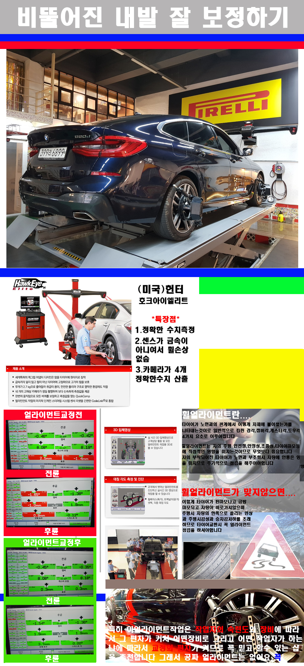 자사는 얼라이먼트정렬시 교정전 교정후를 구분하여 고객님께 직접 이수치값을 확인시켜드리고 작업을 하며 이후 각각의 특성을 가진 타이어들에 대해서 설명 및 관리요령 운전요령 같이 설명해드리고 있습니다