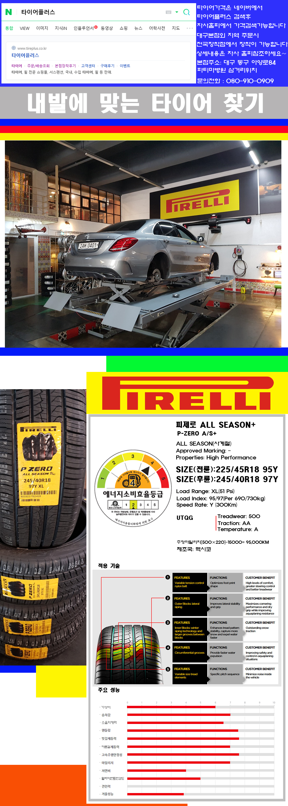 ♥♥♥본점 대구 동구 아양로84 (파티마삼거리 위치) 국산 수입타이어 할인행사중♥♥♥ 타이어플러스 대구본점은 전국에서 가장 규모가 큰매장입니다 물론 자사는 지하층 지상4층건물이며 1층작업장이외는 모두 창고로 사용중인 회사입니다 대구광역시 동구 아양로84(파티마병원 네거리에 위치) 그래서 매장으로 바로 오시면 당일에 바로 장착이 가능합니다 물론 한국 금호 넥센 브리지스톤 미쉐린 콘티넨탈 피렐리 던롭 굳이어 요코하마 등 세계유수의 10대 브랜드타이어만 취급하고 있습니다 타이어매장중 단일규모로는 아마 전국에서 제일 커지않을까 생각합니다 물론 장비도 현존하는 장비중 가장 최신장비와 그리고 유럽풍 인테리어의 최고급매장입니다 무엇하나 정품만 취급하며 작업또한 꼼꼼하게 매뉴얼에 따라서 작업을 해드립니다 특히 사장님의 이력이 화려한데 레이스로서 경험한 풍부한 자동차의 지식을 갖춘분이십니다 그래서 사장님께서 직접상담해주시고 장착도 해주시는 매장이기에 더 신뢰가 가지 않을까 생각합니다 자사는 인터넷 최저가 기반으로 성장한 회사이기에 가격또한 인터넷 최저가로 장착해 드리고 있습니다 그리고 자사는 고객만족도에서 대상까지 수상한 회사입니다 그래서 한번 저의 매장에서 작업하신 고객님은 아마 다른곳에서는 아마 눈에 차지 않을것이라 생각합니다 가격이면 가격 작업의 완성도면 완성도 그리고 사후 관리까지 최고중에 최고가 되기위해서 노력하는 매장입니다 지금까지 어느 매장에서도 느끼지 못한 감성들을 느끼시기를 바랍니다 감사합니다 피렐리타이어에 대해서 생소하시죠 이회사는 전세계 시장점유율4위정도하는 프리미엄타이어를 전문적으로 생산공급하며 주로 신차용 순정품타이어를 공급하는 고급타이어를 위주로 생산하는 회사입니다 참고로 승용차용 패턴은 피제로타이어와 P7타이어가 있습니다 물론 여름용타이어입니다 그리고 이여름용타이어는 100%가 수입차량의 순정품타이어로 장착됩니다 그리고 타이어성상에 따라서 런플랫타이어와 일반타이어 스폰지타이어 씰타이어이렇게 공급이 되며 그리고 이후 RE용시장용으로 올시즌타이어가 공급이 되고 있습니다 그리고 위의 제품의 원산지는 멕시코이며 사계절용타이어이지만 소음억제력과 특히 승차감과 차량의 퍼포먼스능력을 극대화 시켜놓은 타이어입니다 아마 현존하는 사계절용타이어중 퍼포먼스능력이 제일 좋은 제품이 아닐까 생각합니다 이미 이회사의 상품에대한 우수성이나 신뢰도는 언급을 하지 않으셔도 어느정도의 제품밸류를 가진 회사인것도 아실것 같습니다 고급타이어를 선호하시는 고객님께 추천하는 브랜드입니다 제품의 우수성과 밸류그리고 성능까지 갖춘 제품들로 라인업이 되어져 있는 브랜드입니다 감사합니다