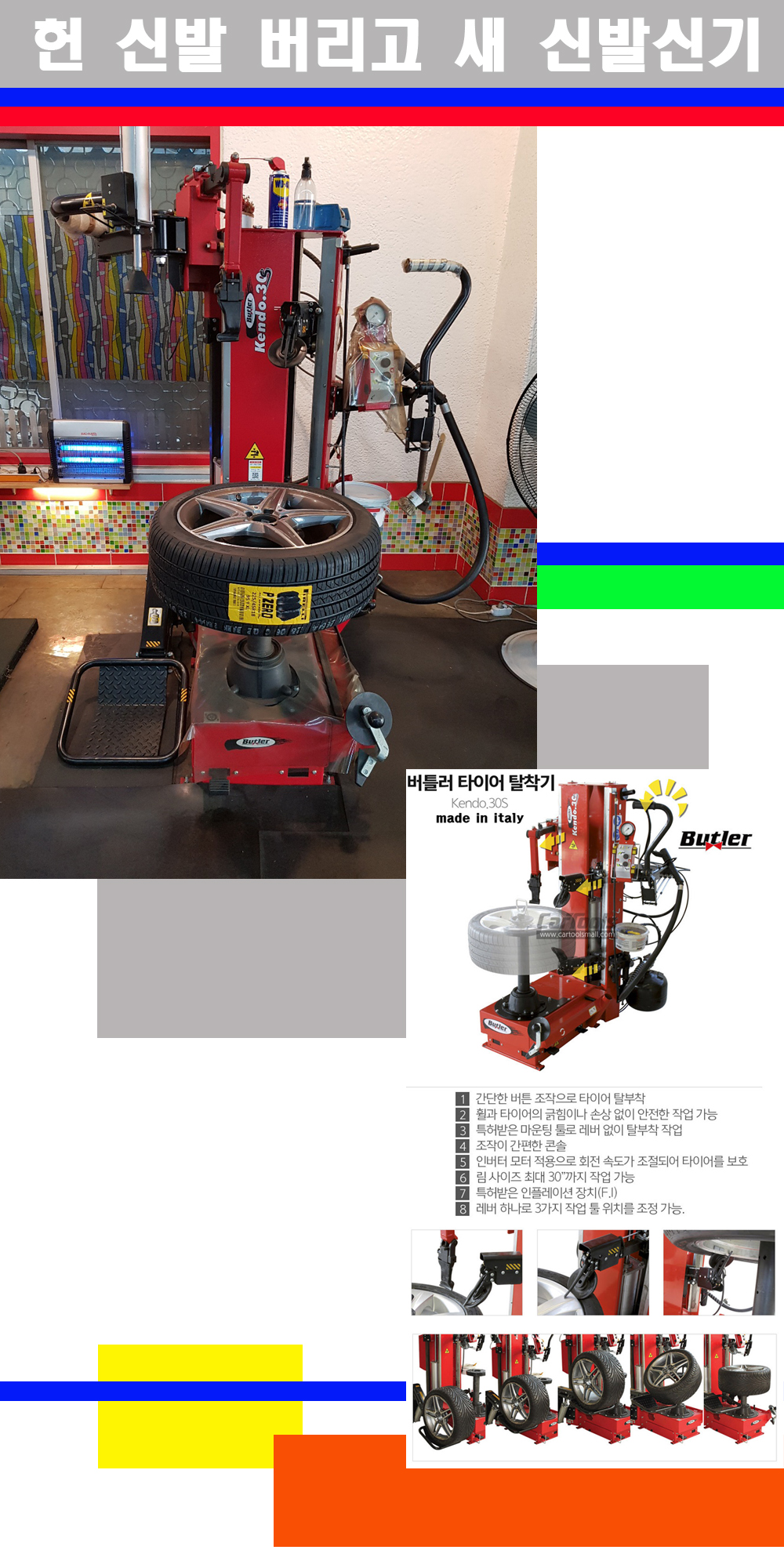 이태리 버틀러사의 켄도3.0S는 휠과 타이어와 조립과 분리시 전혀 제품에 손상을 주지않는 탈착기로 특히 센터락방식이여서 휠의 중앙부위 잡아서 타이어를 탈부착하고 이후 상하롤러로 타이어를 탈부착합니다 특히 유니포미티작업(휠의 가장가벼운부분과 타이어의 가장 무거운부분을 매칭시키는 작업)시 작업자가 타이어를 정확한 지점에 휠과 매칭시킬수 있는 장점도 있습니다