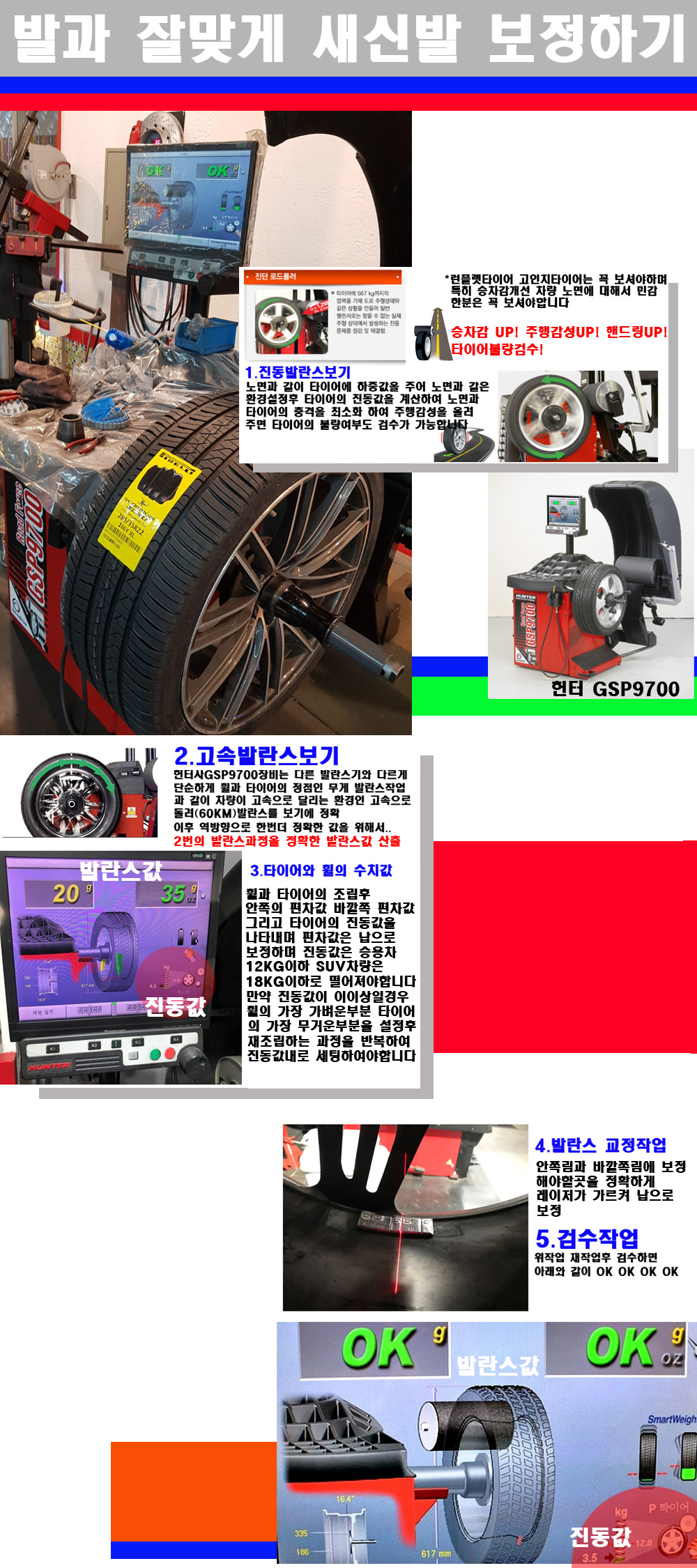 이장비는 노면에서 올라오는 진동값까지 계산하여 발란스값을 보는 방식으로 진동발란스기는 헌터사GSP9700장비가 유일합니다 이후 역방향으로 60키로의 고속으로 다시 발란스값을 보정하는 방식입니다