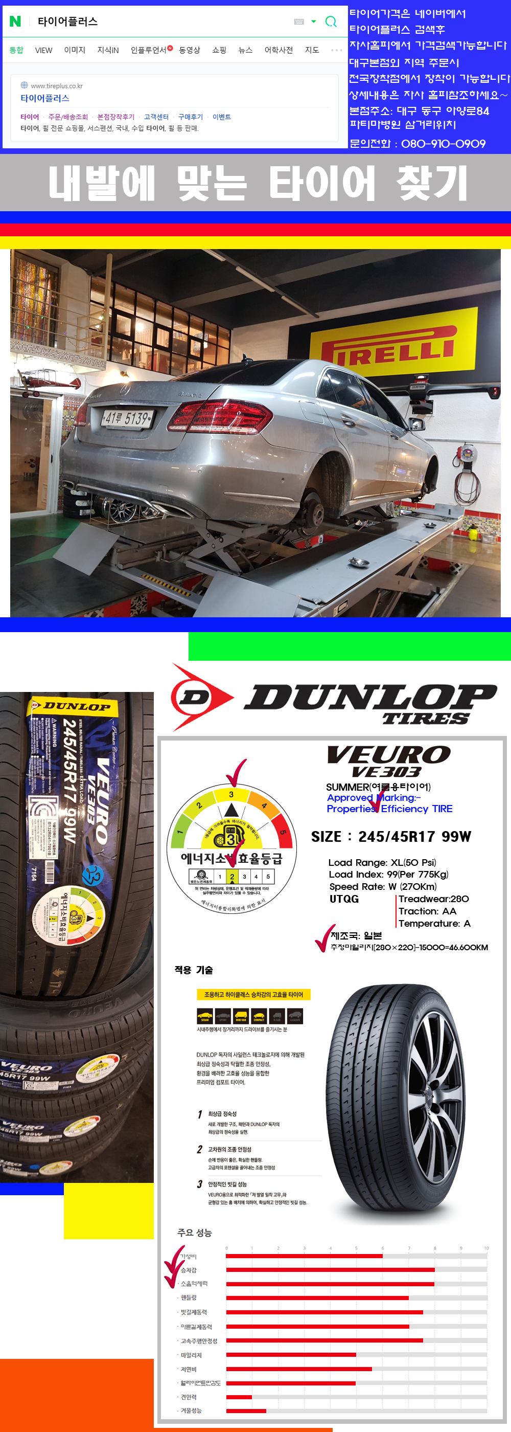 ♥♥♥본점 대구 동구 아양로84 (파티마삼거리 위치) 국산 수입타이어 할인행사중♥♥♥ 타이어플러스 대구본점은 전국에서 가장 규모가 큰매장입니다 물론 자사는 지하층 지상4층건물이며 1층작업장이외는 모두 창고로 사용중인 회사입니다 대구광역시 동구 아양로84(파티마병원 네거리에 위치) 그래서 매장으로 바로 오시면 당일에 바로 장착이 가능합니다 물론 한국 금호 넥센 브리지스톤 미쉐린 콘티넨탈 피렐리 던롭 굳이어 요코하마 등 세계유수의 10대 브랜드타이어만 취급하고 있습니다 타이어매장중 단일규모로는 아마 전국에서 제일 커지않을까 생각합니다 물론 장비도 현존하는 장비중 가장 최신장비와 그리고 유럽풍 인테리어의 최고급매장입니다 무엇하나 정품만 취급하며 작업또한 꼼꼼하게 매뉴얼에 따라서 작업을 해드립니다 특히 사장님의 이력이 화려한데 레이스로서 경험한 풍부한 자동차의 지식을 갖춘분이십니다 그래서 사장님께서 직접상담해주시고 장착도 해주시는 매장이기에 더 신뢰가 가지 않을까 생각합니다 자사는 인터넷 최저가 기반으로 성장한 회사이기에 가격또한 인터넷 최저가로 장착해 드리고 있습니다 그리고 자사는 고객만족도에서 대상까지 수상한 회사입니다 그래서 한번 저의 매장에서 작업하신 고객님은 아마 다른곳에서는 아마 눈에 차지 않을것이라 생각합니다 가격이면 가격 작업의 원성도면 원성도 그리고 사후 관리까지 최고중에 최고가 되기위해서 노력하는 매장입니다 지금까지 어느 매장에서도 느끼지 못한 감성들을 느끼시기를 바랍니다 감사합니다 던롭타이어에 대해서 조금 생소하시죠!! 이타이어회사는 영국에 본사를 두고있는 전세계 시장점유률 7위정도하는 회사입니다 물론 지금은 전세계에서 생산하는 다국적 기업입니다 현재는 일본등지에서 OE방식으로 많이 생산되고 있습니다 이던롭타이어는 처음 고무로된 타이어는 완충작용을 하지못해서 던롭이라는 개발자의 아들이 자전거를 타고 가다가 많이 다쳐서 안락하고 승차감있는 타이어를 만들기 위해서 공기를 주입하는 튜브식 타이어를 만든 사람이 던롭입니다 물론 이분은 의사입니다 그래서 그런지 여러 사용상의 필요에 의해서 많이 관철하고 어떤 타이어가 좋은지에 대해서 연구를 많이 해서 만들어진 타이어가 최초의 공기 충전식 타이어이며 그후 대량생산하게 된 회사가 던롭타이어입니다 물론 이회사는 일본차종 및 독일차종에 순정품으로 장착이 되는 타이어이며 순정품이후 대체시장용(RE)으로 현재는 LM704 EC504 EC204등 여러가지 패턴들이 공급되고 있습니다 전반적으로 RE용타이어들을 보면 에너지 효율이 높고 배수성능이 좋은 여름용타이어를 주력으로 공급하고 있습니다 일본에서 생산되는 던롭타이어들의 특성들은 승차감이 좋고 소음억제력이 좋다입니다 그리고 시장에 공략하는 가격도 착해서 한번쯤 장착을 권장하고 싶은 제품들입니다 참고로 타이어의 본래의 특성을 지닌 타이어는 여름용타이어입니다 부드러워서 승차감이 좋고 커프와 사이프와 핀수가 적어 소음억제력이 좋으며 잘서고 잘달리며 잘돕니다 하지만 수명이 4계절용타이어에 비해서 20~30%정도 짧으며 결빙된 노면에서 제동거리가 조금 더길다는 단점이 있습니다 그렇다고 겨울에 여름용타이어를 사용하지 말라는 것은 아닙니다 영상7도씨 밑에서의 타이어 딱딱해지는 경화성은 4계절용타이어나 여름용타이어 모두 가지는 단점이기에 겨울철에는 겨울용타이어를 장착하시는 것이 가장좋은 방법입니다 고객님께서 많이 오해하시는것이 여름용타이어는 여름에만 사용한다인데 이것은 잘못된 상식입니다 여름철에 가장 타이어의 성능이 극대화되기에 여름용타이어라고 이름을 붙이는 것입니다 4계절내내 사용하셔도 무관합니다 그리고 4계절용타이어는 4계절동안 무난하게 사용이 가능한 타이어라고 생각하시면됩니다 그리고 수입되는 수입차종은 100%가 여름용타이어가 장착되는 이유입니다 감사합니다