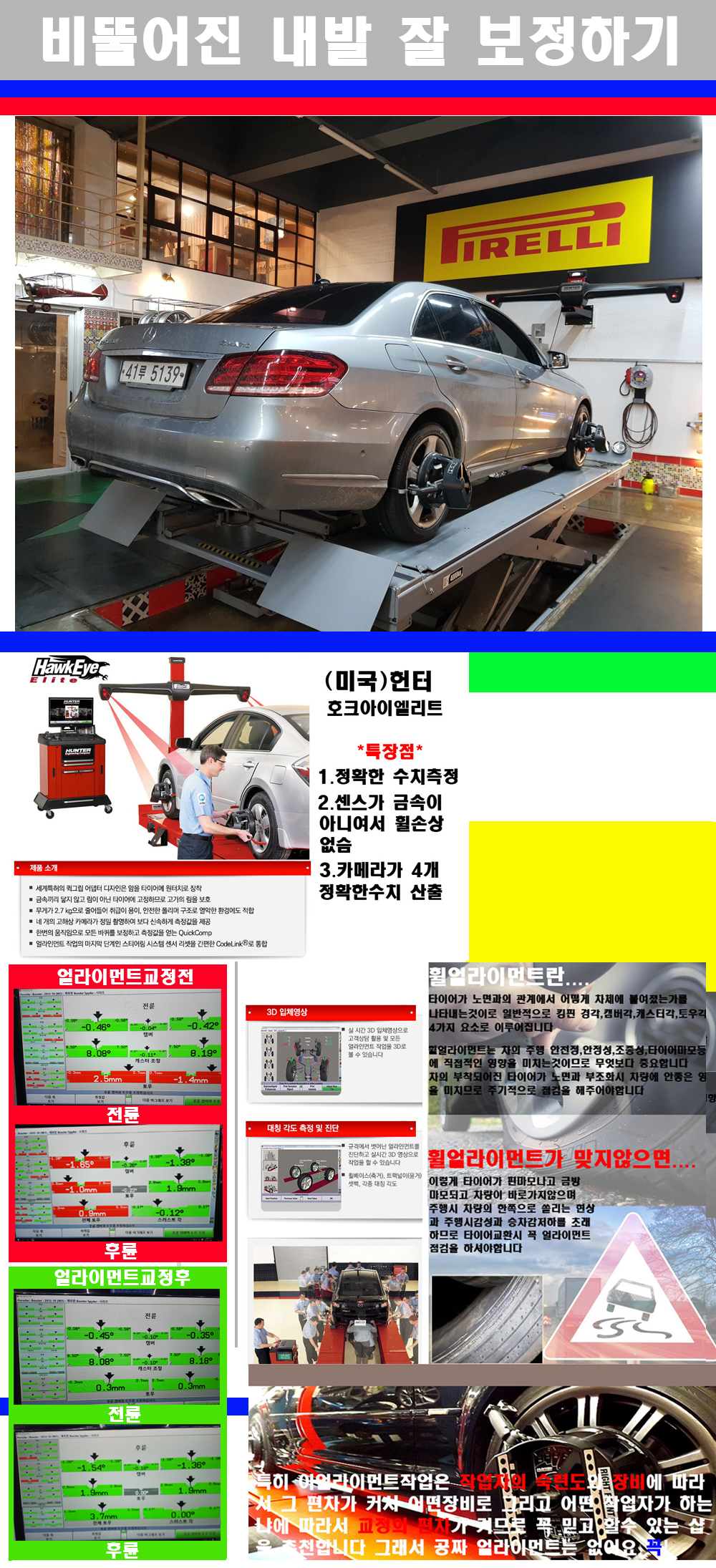 자사는 얼라이먼트정렬시 교정전 교정후를 구분하여 고객님께 직접 이수치값을 확인시켜드리고 작업을 하며 이후 각각의 특성을 가진 타이어들에 대해서 설명 및 관리요령 운전요령 같이 설명해드리고 있습니다