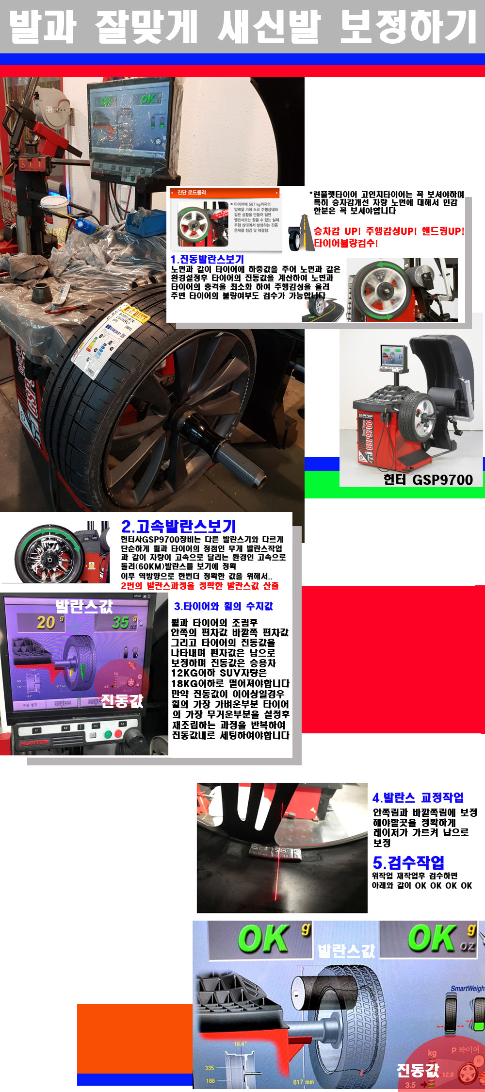 이장비는 노면에서 올라오는 진동값까지 계산하여 발란스값을 보는 방식으로 진동발란스기는 헌터사GSP9700장비가 유일합니다 이후 역방향으로 60키로의 고속으로 다시 발란스값을 보정하는 방식입니다