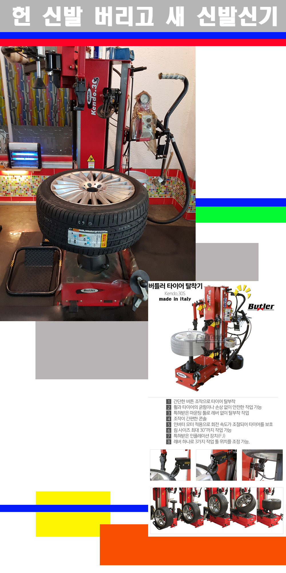 이태리 버틀러사의 켄도3.0S는 휠과 타이어와 조립과 분리시 전혀 제품에 손상을 주지않는 탈착기로 특히 센터락방식이여서 휠의 중앙부위 잡아서 타이어를 탈부착하고 이후 상하롤러로 타이어를 탈부착합니다 특히 유니포미티작업(휠의 가장가벼운부분과 타이어의 가장 무거운부분을 매칭시키는 작업)시 작업자가 타이어를 정확한 지점에 휠과 매칭시킬수 있는 장점도 있습니다