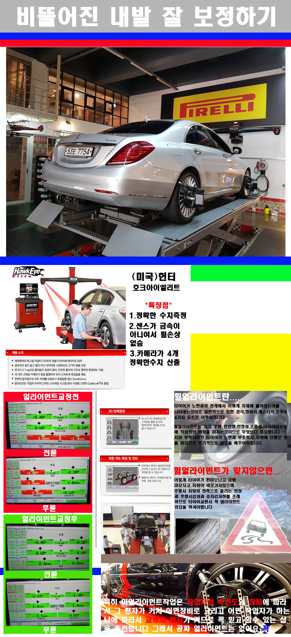 자사는 얼라이먼트정렬시 교정전 교정후를 구분하여 고객님께 직접 이수치값을 확인시켜드리고 작업을 하며 이후 각각의 특성을 가진 타이어들에 대해서 설명 및 관리요령 운전요령 같이 설명해드리고 있습니다