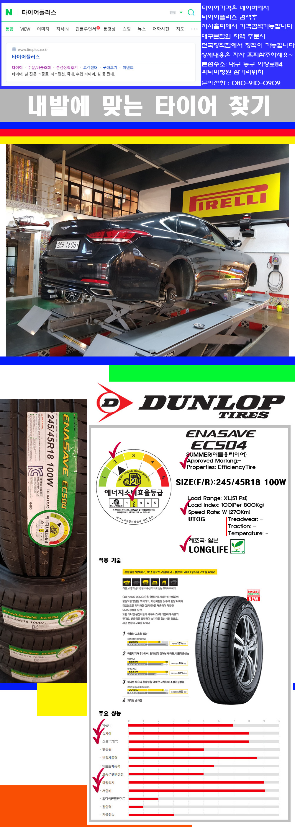 물론 한국 금호 넥센 브리지스톤 미쉐린 콘티넨탈 피렐리 던롭 굳이어 요코하마 등 세계유수의 10대 브랜드타이어만 취급하고 있습니다 타이어매장중 단일규모로는 아마 전국에서 제일 커지않을까 생각합니다 가격도 인터넷 최저가로 장착해 드리고 있습니다 고객님들이 오시면서 너무 고급스러워 가격도 비싸지 않을까 생각하시는데 네이버에서 타이어플러스사이트를 검색해보시면 가격 또한 정말 싸게 판매하고 있구나 하고 생각하실것입니다 자사홈피가격은 장착비 포함가격입니다 물론 장비도 현존하는 장비중 가장 최신장비와 그리고 유럽풍 인테리어의 최고급매장입니다 무엇하나 정품만 취급하며 작업또한 꼼꼼하게 매뉴얼에 따라서 작업을 해드립니다 특히 사장님의 이력이 화려한데 레이스로서 경험한 풍부한 자동차의 지식을 갖춘분이십니다 그래서 사장님께서 직접상담해주시고 장착도 해주시는 매장이기에 더 신뢰가 가지 않을까 생각합니다 자사는 인터넷 최저가 기반으로 성장한 회사이기에 가격또한 인터넷 최저가로 장착해 드리고 있습니다 그리고 자사는 고객만족도에서 대상까지 수상한 회사입니다 그래서 한번 저의 매장에서 작업하신 고객님은 아마 다른곳에서는 아마 눈에 차지 않을것이라 생각합니다 가격이면 가격 작업의 완성도면 완성도 그리고 사후 관리까지 최고중에 최고가 되기위해서 노력하는 매장입니다 지금까지 어느 매장에서도 느끼지 못한 감성들을 느끼시기를 바랍니다 감사합니다 던롭타이어에 대해서 조금 생소하시죠!! 이타이어회사는 영국에 본사를 두고있는 전세계 시장점유률 7위정도하는 회사입니다 물론 지금은 전세계에서 생산하는 다국적 기업입니다 현재는 일본등지에서 OE방식으로 많이 생산되고 있습니다 이던롭타이어는 처음 고무로된 타이어는 완충작용을 하지못해서 던롭이라는 개발자의 아들이 자전거를 타고 가다가 많이 다쳐서 안락하고 승차감있는 타이어를 만들기 위해서 공기를 주입하는 튜브식 타이어를 만든 사람이 던롭입니다 물론 이분은 의사입니다 그래서 그런지 여러 사용상의 필요에 의해서 많이 관철하고 어떤 타이어가 좋은지에 대해서 연구를 많이 해서 만들어진 타이어가 최초의 공기 충전식 타이어이며 그후 대량생산하게 된 회사가 던롭타이어입니다 물론 이회사는 일본차종 및 독일차종에 순정품으로 장착이 되는 타이어이며 순정품이후 대체시장용(RE)으로 현재는 LM704 EC504 EC204등 여러가지 패턴들이 공급되고 있습니다 전반적으로 RE용타이어들을 보면 에너지 효율이 높고 배수성능이 좋은 여름용타이어를 주력으로 공급하고 있습니다 일본에서 생산되는 던롭타이어들의 특성들은 승차감이 좋고 소음억제력이 좋다입니다 그리고 시장에 공략하는 가격도 착해서 한번쯤 장착을 권장하고 싶은 제품들입니다 참고로 타이어의 본래의 특성을 지닌 타이어는 여름용타이어입니다 부드러워서 승차감이 좋고 커프와 사이프와 핀수가 적어 소음억제력이 좋으며 잘서고 잘달리며 잘돕니다 하지만 수명이 4계절용타이어에 비해서 20~30%정도 짧으며 결빙된 노면에서 제동거리가 조금 더길다는 단점이 있습니다 그렇다고 겨울에 여름용타이어를 사용하지 말라는 것은 아닙니다 영상7도씨 밑에서의 타이어 딱딱해지는 경화성은 4계절용타이어나 여름용타이어 모두 가지는 단점이기에 겨울철에는 겨울용타이어를 장착하시는 것이 가장좋은 방법입니다 이제품은 비오는날 제동거리가 4계절용타이어보다 30%정도 짧으며 특히 마른길 노면에서의 제동거리가 20~33%정도 짧아지며 소음억제력과 승차감구현력이 좋아 한국정서에 잘맞는 제품입니다 한번쯤 장착을 권장해드립니다 찾아주셔서 감사합니다