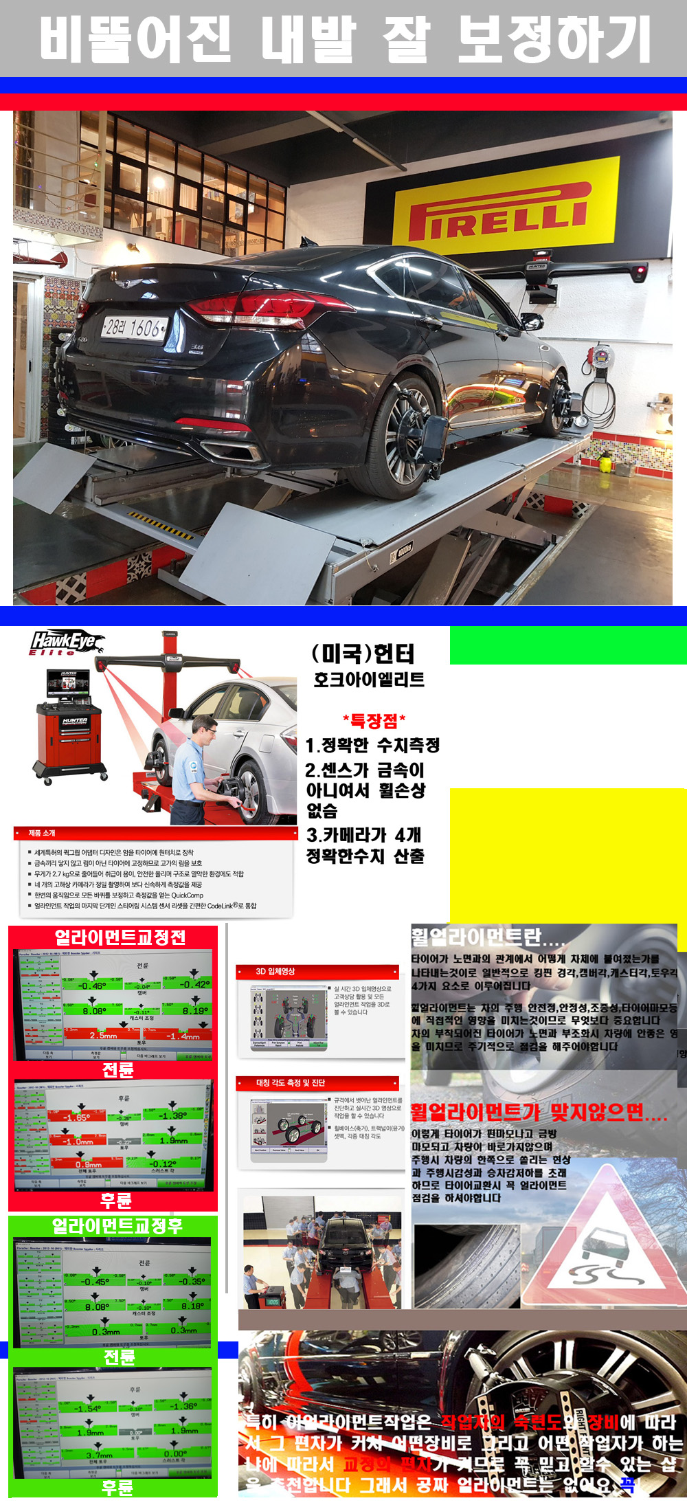 자사는 얼라이먼트정렬시 교정전 교정후를 구분하여 고객님께 직접 이수치값을 확인시켜드리고 작업을 하며 이후 각각의 특성을 가진 타이어들에 대해서 설명 및 관리요령 운전요령 같이 설명해드리고 있습니다