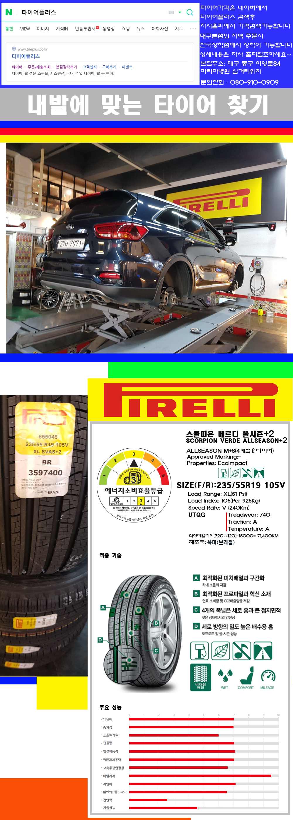 ♥♥♥본점 대구 동구 아양로84 (파티마삼거리 위치) 국산 수입타이어 할인행사중♥♥♥ 타이어플러스 대구본점은 전국에서 가장 규모가 큰매장입니다 물론 자사는 지하층 지상4층건물이며 1층작업장이외는 모두 창고로 사용중인 회사입니다 대구광역시 동구 아양로84(파티마병원 네거리에 위치) 그래서 매장으로 바로 오시면 당일에 바로 장착이 가능합니다 물론 한국 금호 넥센 브리지스톤 미쉐린 콘티넨탈 피렐리 던롭 굳이어 요코하마 등 세계유수의 10대 브랜드타이어만 취급하고 있습니다 타이어매장중 단일규모로는 아마 전국에서 제일 커지않을까 생각합니다 물론 장비도 현존하는 장비중 가장 최신장비와 그리고 유럽풍 인테리어의 최고급매장입니다 무엇하나 정품만 취급하며 작업또한 꼼꼼하게 매뉴얼에 따라서 작업을 해드립니다 특히 사장님의 이력이 화려한데 레이스로서 경험한 풍부한 자동차의 지식을 갖춘분이십니다 그래서 사장님께서 직접상담해주시고 장착도 해주시는 매장이기에 더 신뢰가 가지 않을까 생각합니다 자사는 인터넷 최저가 기반으로 성장한 회사이기에 가격또한 인터넷 최저가로 장착해 드리고 있습니다 그리고 자사는 고객만족도에서 대상까지 수상한 회사입니다 그래서 한번 저의 매장에서 작업하신 고객님은 아마 다른곳에서는 아마 눈에 차지 않을것이라 생각합니다 가격이면 가격 작업의 완성도면 완성도 그리고 사후 관리까지 최고중에 최고가 되기위해서 노력하는 매장입니다 지금까지 어느 매장에서도 느끼지 못한 감성들을 느끼시기를 바랍니다 감사합니다 요즘 SUV전용타이어 많이 시판되고 있습니다 회사별로도 무수한 패턴들이 생산이 되고있습니다 대충 타이어의 성격들을 보면 이러합니다