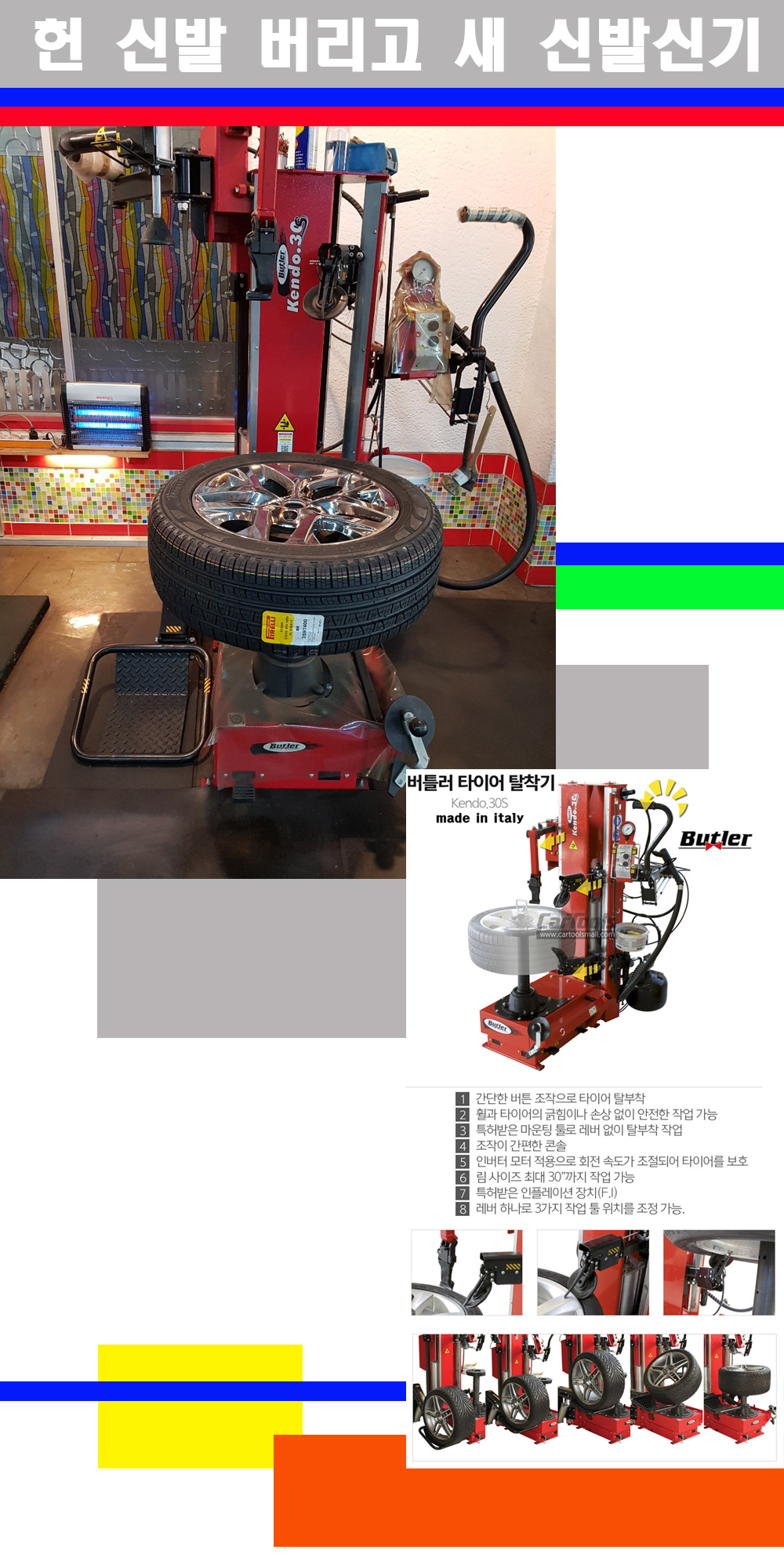 이태리 버틀러사의 켄도3.0S는 휠과 타이어와 조립과 분리시 전혀 제품에 손상을 주지않는 탈착기로 특히 센터락방식(중앙에서 휠를 고정하는 방식)이여서 휠의 중앙부위 잡아서 타이어를 탈부착하고 이후 상하롤러로 타이어를 탈부착합니다 특히 유니포미티작업(휠의 가장가벼운부분과 타이어의 가장 무거운부분을 매칭시키는 작업)시 작업자가 타이어를 정확한 지점에 휠과 매칭시킬수 있는 장점도 있습니다